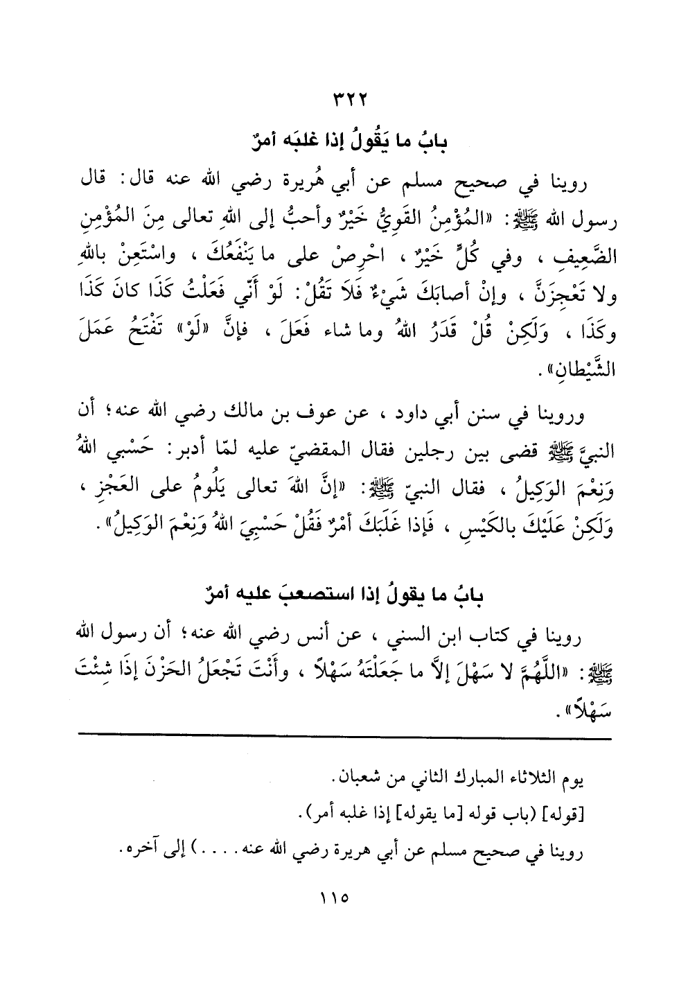 وروينا في سنن أبي داود، عن عوف بن مالك رضي الله عنه؛ أن النبي صلى الله عليه وسلم قضى بين رجلين فقال المقضي عليه لما أدبر: حسبي الله ونعم الوكيل، فقال النبي صلى الله عليه وسلم: ((إن الله تعالى يلوم على العجز، ولكن عليك بالكيس، فإذا غلبك أمرٌ فقل حسبي الله ونعم الوكيل)).