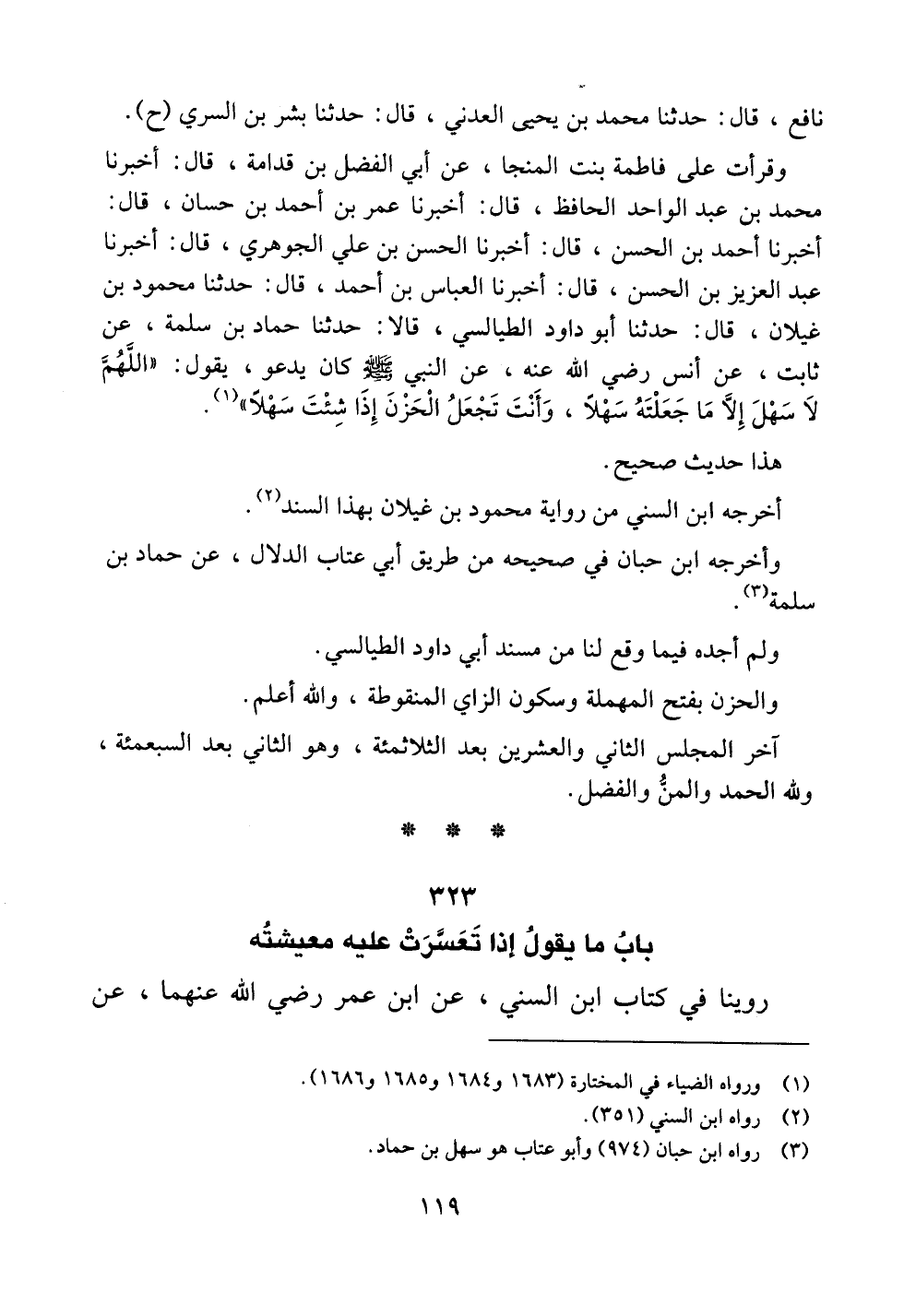 وقرأت على فاطمة بنت المنجا، عن أبي الفضل بن قدامة، قال: أخبرنا محمد بن عبد الواحد الحافظ، قال: أخبرنا عمر بن أحمد بن حسان، قال: أخبرنا أحمد بن الحسن، قال: أخبرنا الحسن بن علي الجوهري، قال: أخبرنا عبد العزيز بن الحسن، قال: أخبرنا العباس بن أحمد، قال: حدثنا محمود بن غيلان، قال: حدثنا أبو داود الطيالسي، قالا: حدثنا حماد بن سلمة، عن ثابت، عن أنس رضي الله عنه، عن النبي صلى الله عليه وسلم كان يدعو، يقول: ((اللهم لا سهل إلا ما جعلته سهلاً، وأنت تجعل الحزن إذا شئت سهلاً)).