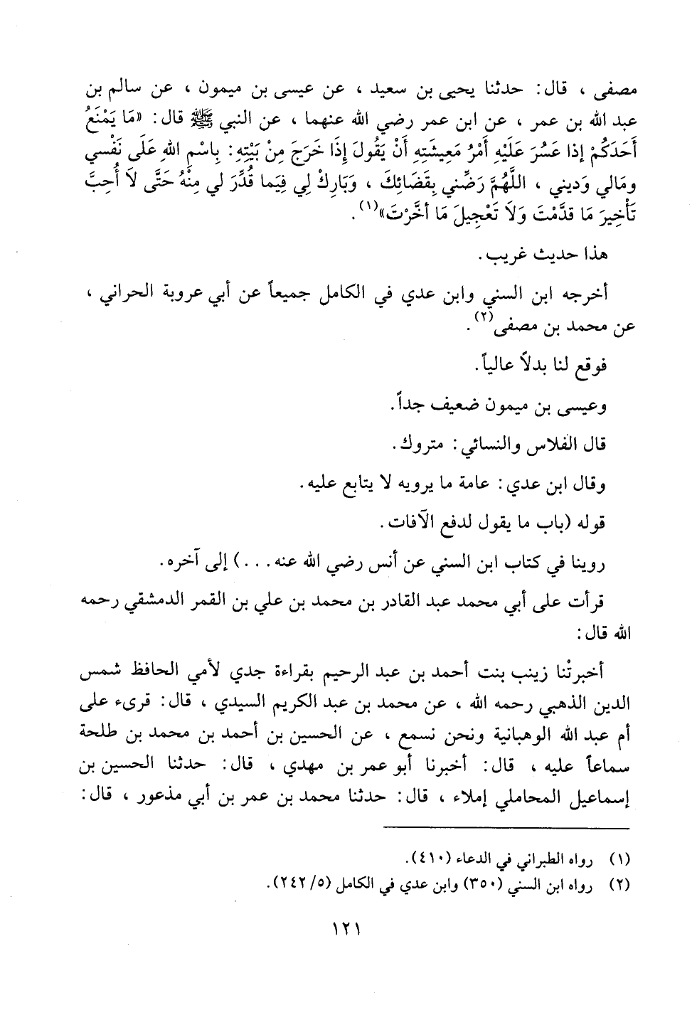 مصفى، قال: حدثنا يحيى بن سعيد، عن عيسى بن ميمون، عن سالم بن عبد الله بن عمر، عن ابن عمر رضي الله عنهما، عن النبي صلى الله عليه وسلم قال: ((ما يمنع أحدكم إذا عسر عليه أمر معيشته أن يقول إذا خرج من بيته: باسم الله على نفسي ومالي وديني، اللهم رضني بقضائك، وبارك لي فيما قدر لي منه حتى لا أحب تأخير ما قدمت ولا تعجيل ما أخرت)).