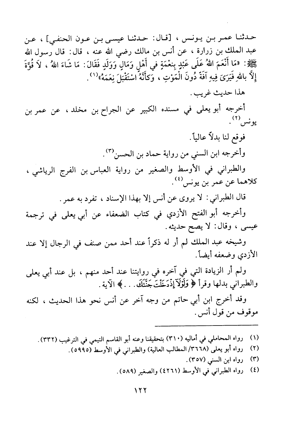 حدثنا عمر بن يونس، [قال: حدثنا عيسى بن عون الحنفي]، عن عبد الملك بن زرارة، عن أنس بن مالك رضي الله عنه، قال: قال رسول الله صلى الله عليه وسلم: ((ما أنعم الله على عبدٍ بنعمةٍ في أهلٍ ومالٍ وولدٍ فقال: ما شاء الله، لا قوة إلا بالله فيرى فيه آفةً دون الموت، وكأنه استقبل نعمه)).