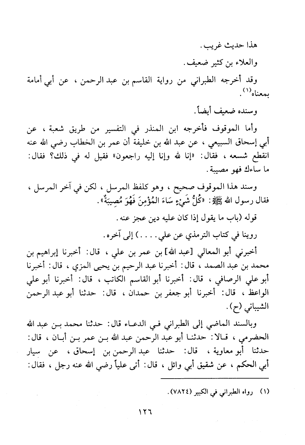 وأما الموقوف فأخرجه ابن المنذر في التفسير من طريق شعبة، عن أبي إسحاق السبيعي، عن عبد الله بن خليفة أن عمر بن الخطاب رضي الله عنه انقطع شسعه، فقال: ((إنا لله وإنا إليه راجعون)) فقيل له في ذلك؟ فقال: ما ساءك فهو مصيبة.