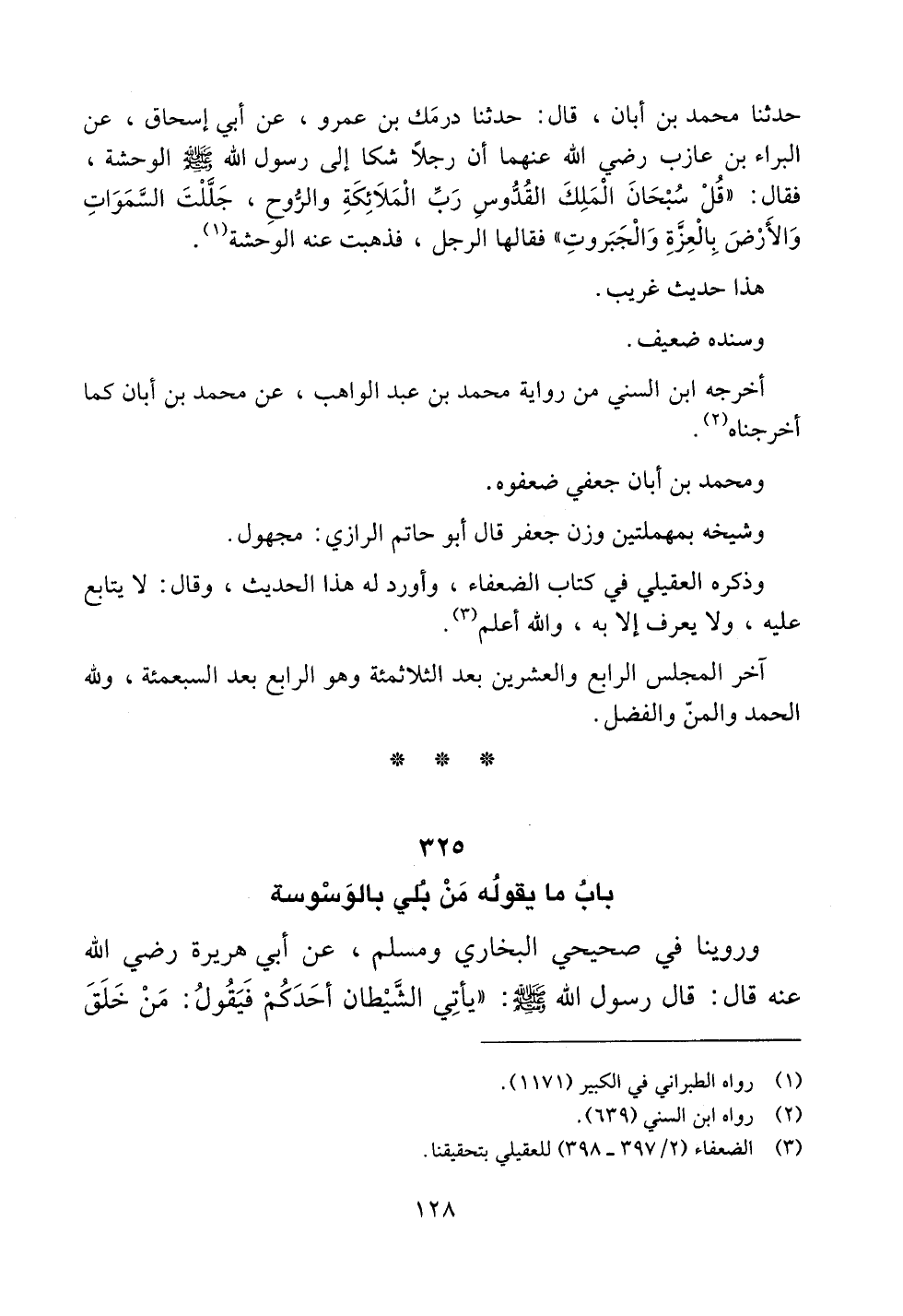 آخر المجلس الرابع والعشرين بعد الثلاثمئة وهو الرابع بعد السبعمئة، ولله الحمد والمن والفضل.