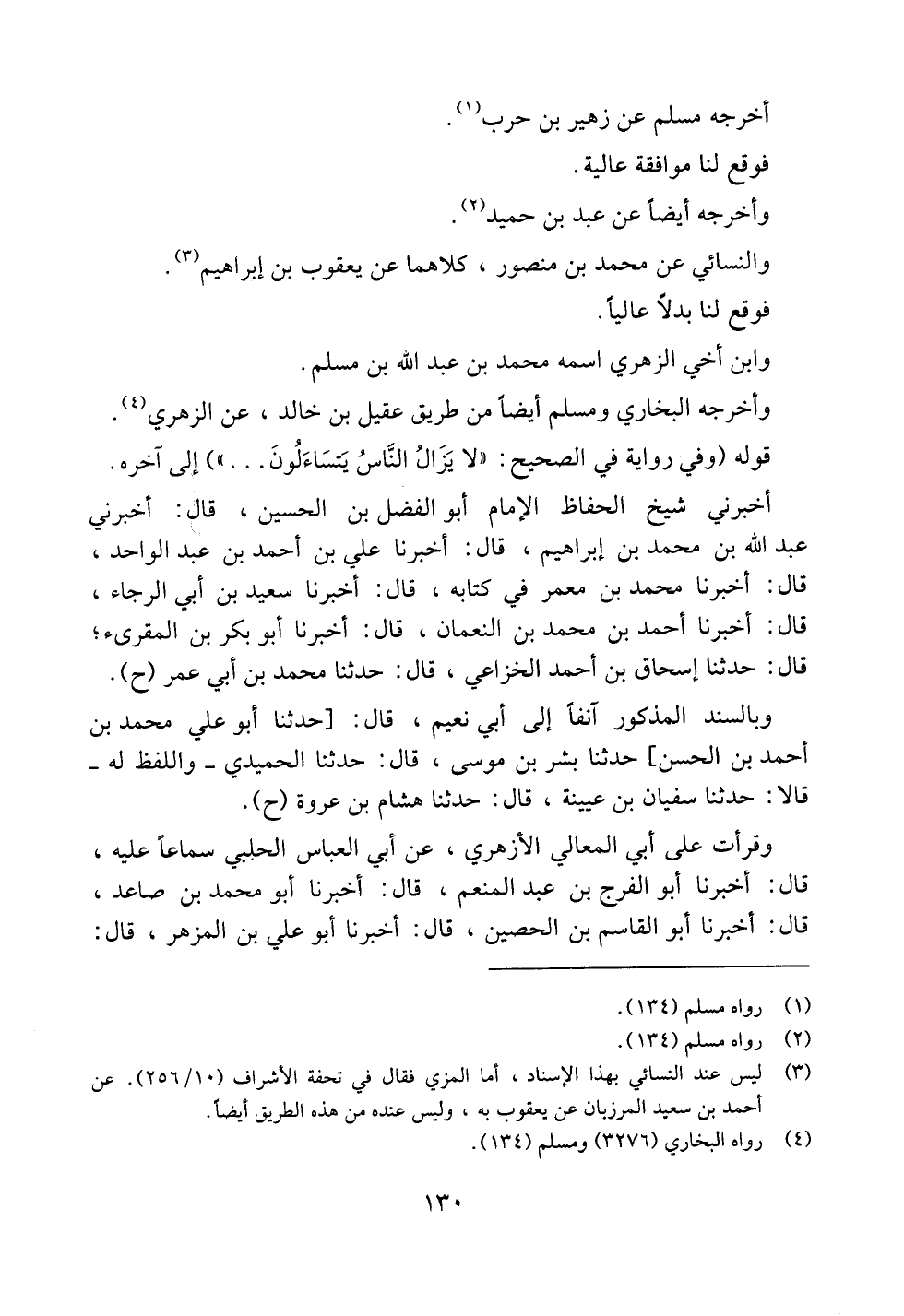 وقرأت على أبي المعالي الأزهري، عن أبي العباس الحلبي سماعاً عليه، قال: أخبرنا أبو الفرج بن عبد المنعم، قال: أخبرنا أبو محمد بن صاعد، قال: أخبرنا أبو القاسم بن الحصين، قال: أخبرنا أبو علي بن المزهر، قال: