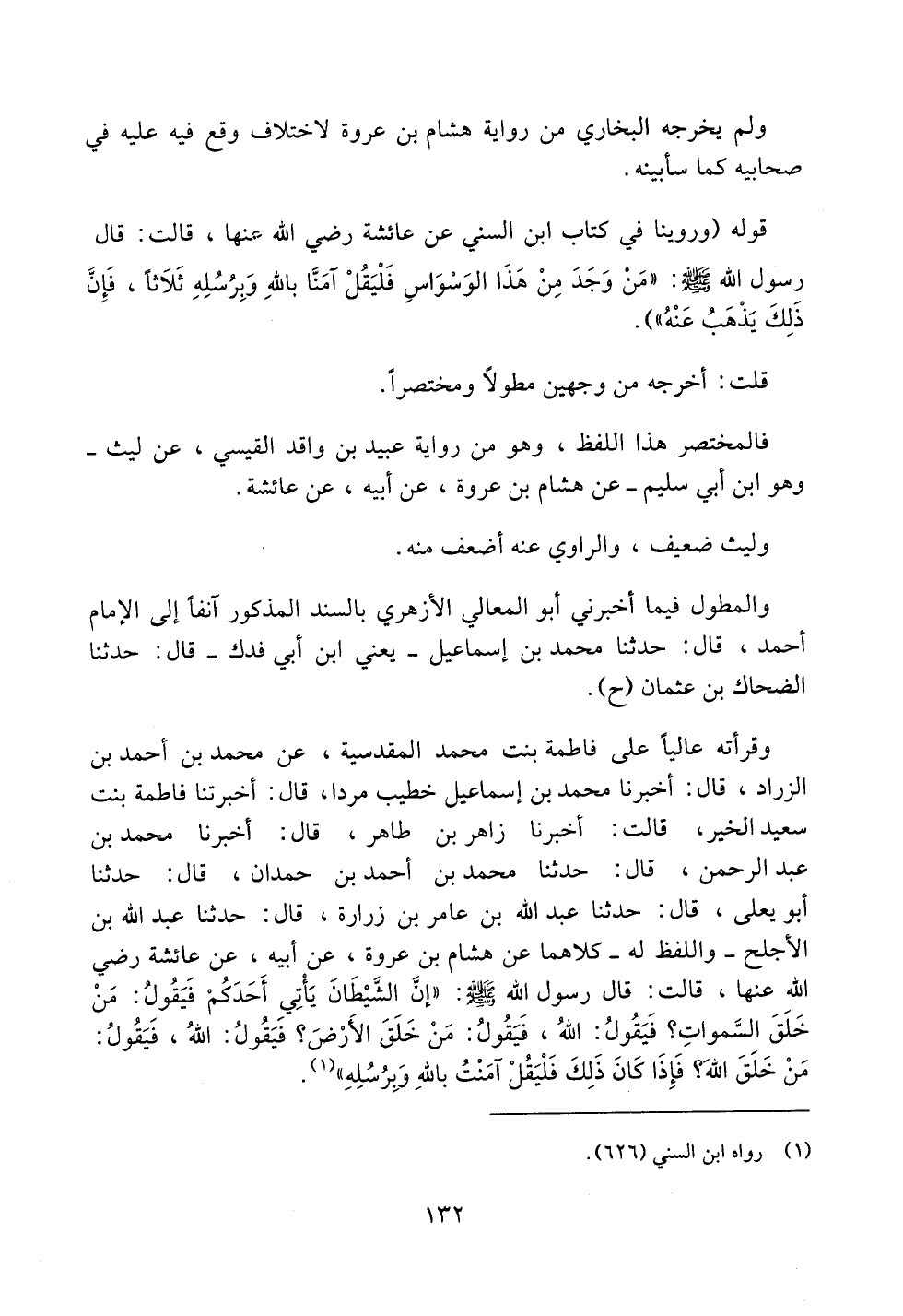 وقرأته عالياً على فاطمة بنت محمد المقدسية، عن محمد بن أحمد بن الزراد، قال: أخبرنا محمد بن إسماعيل خطيب مردا، قال: أخبرتنا فاطمة بنت سعيد الخير، قالت: أخبرنا زاهر بن طاهر، قال: أخبرنا محمد بن عبد الرحمن، قال: حدثنا محمد بن أحمد بن حمدان، قال: حدثنا أبو يعلى، قال: حدثنا عبد الله بن عامر بن زرارة، قال: حدثنا عبد الله بن الأجلح -واللفظ له- كلاهما عن هشام بن عروة، عن أبيه، عن عائشة رضي الله عنها، قالت: قال رسول الله صلى الله عليه وسلم: ((إن الشيطان يأتي أحدكم فيقول: من خلق السموات؟ فيقول: الله، فيقول: من خلق الأرض؟ فيقول: الله، فيقول: من خلق الله؟ فإذا كان ذلك فليقل آمنت بالله وبرسله)).