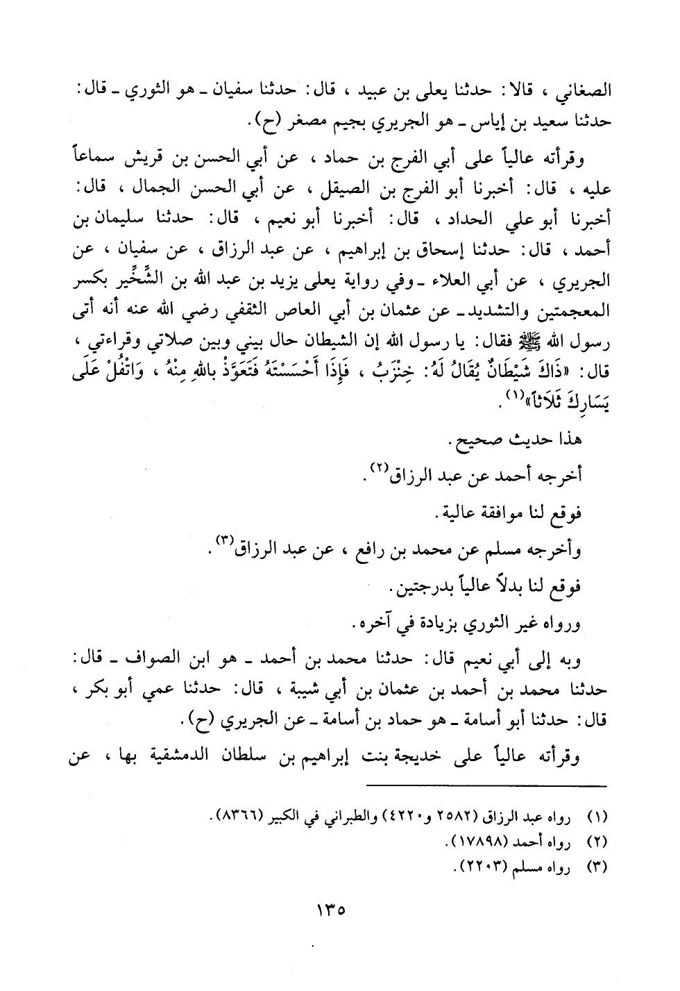 وقرأته عالياً على أبي الفرج بن حماد، عن أبي الحسن بن قريش سماعاً عليه، قال: أخبرنا أبو الفرج بن الصيقل، عن أبي الحسن الجمال، قال: أخبرنا أبو علي الحداد، قال: أخبرنا أبو نعيم، قال: حدثنا سليمان بن أحمد، قال: حدثنا إسحاق بن إبراهيم، عن عبد الرزاق، عن سفيان، عن الجريري، عن أبي العلاء -وفي رواية يعلى يزيد بن عبد الله بن الشخير بكسر المعجمتين والتشديد- عن عثمان بن أبي العاص الثقفي رضي الله عنه أنه أتى رسول الله صلى الله عليه وسلم فقال: يا رسول الله إن الشيطان حال بيني وبين صلاتي وقراءتي، قال: ((ذاك شيطانٌ يقال له: خنزب، فإذا أحسسته فتعوذ بالله منه، واتفل على يسارك ثلاثاً)).