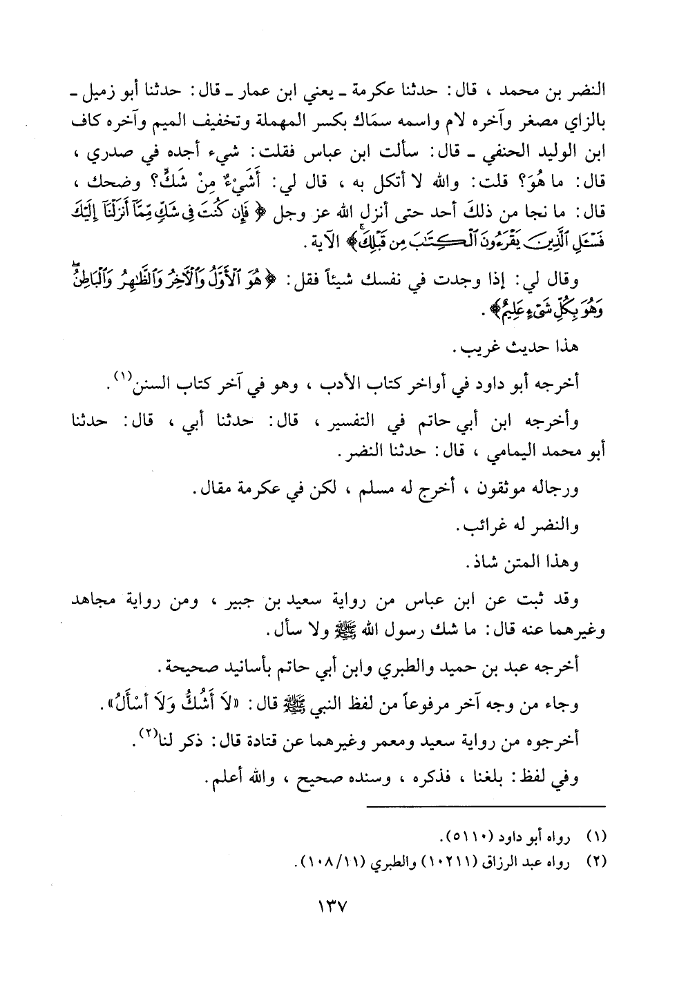 النضر بن محمد، قال: حدثنا عكرمة -يعني ابن عمار- قال: حدثنا أبو زميل -بالزاي مصغر وآخره لام واسمه سماك بكسر المهملة وتخفيف الميم وآخره كاف ابن الوليد الحنفي- قال: سألت ابن عباس فقلت: شيء أجده في صدري، قال: ما هو؟ قلت: والله لا أتكل به، قال لي: أشيءٌ من شك؟ وضحك، قال: ما نجا من ذلك أحد حتى أنزل الله عز وجل {فإن كنت في شكٍ مما أنزلنا إليك فسئل الذين يقرءون الكتاب من قبلك} الآية.