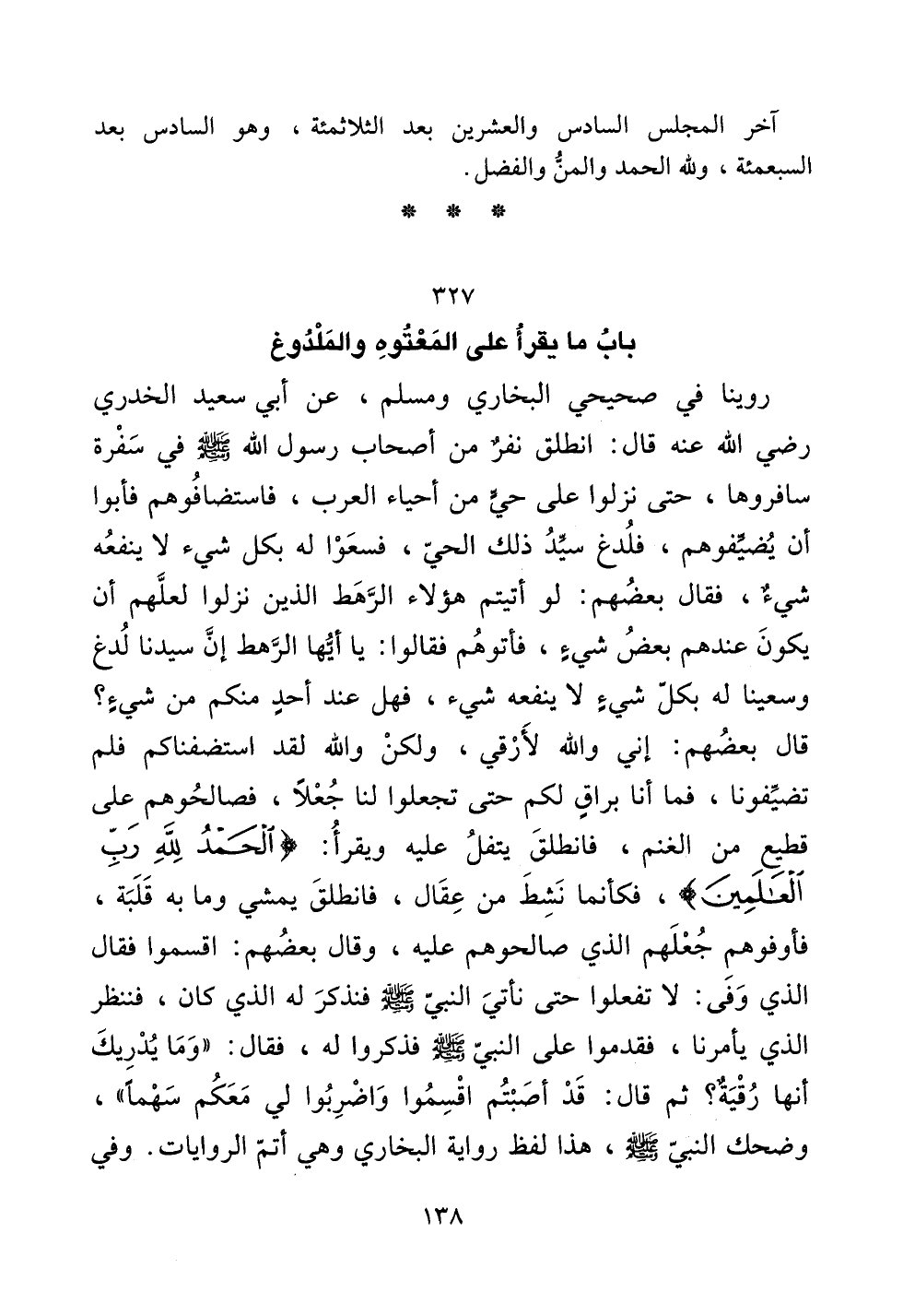 روينا في صحيحي البخاري ومسلم، عن أبي سعيد الخدري رضي الله عنه قال: انطلق نفرٌ من أصحاب رسول الله صلى الله عليه وسلم في سفرة سافروها، حتى نزلوا على حي من أحياء العرب، فاستضافوهم فأبوا أن يضيفوهم، فلدغ سيد ذلك الحي، فسعوا له بكل شيء لا ينفعه شيءٌ، فقال بضعهم: لو أتيتم هؤلاء الرهط الذين نزلوا لعلهم أن يكون عندهم بعض شيءٍ، فأتوهم فقالوا: يا أيها الرهط إن سيدنا لدغ وسعينا له بكل شيءٍ لا ينفعه شيء، فهل عند أحدٍ منكم من شيءٍ؟ قال بعضهم: إني والله لأرقي، ولكن والله لقد استضفناكم فلم تضيفونا، فما أنا براقٍ لكم حتى تجعلوا لنا جعلاً، فصالحوهم على قطيعٍ من الغنم، فانطلق يتفل عليه ويقرأ: {الحمد لله رب العالمين}، فكأنما نشط من عقال، فانطلق يمشي وما به قلبة، فأوفوهم جعلهم الذي صالحوهم عليه، وقال بعضهم: اقسموا فقال الذي وفى: لا تفعلوا حتى نأتي النبي صلى الله عليه وسلم فنذكر له الذي كان، فننظر الذي يأمرنا، فقدموا على النبي صلى الله عليه وسلم فذكروا له، فقال: ((وما يدريك أنها رقيةٌ؟ ثم قال: قد أصبتم اقسموا واضربوا لي معكم سهماً))، وضحك النبي صلى الله عليه وسلم، هذا لفظ رواية البخاري وهي أتم الروايات. وفي