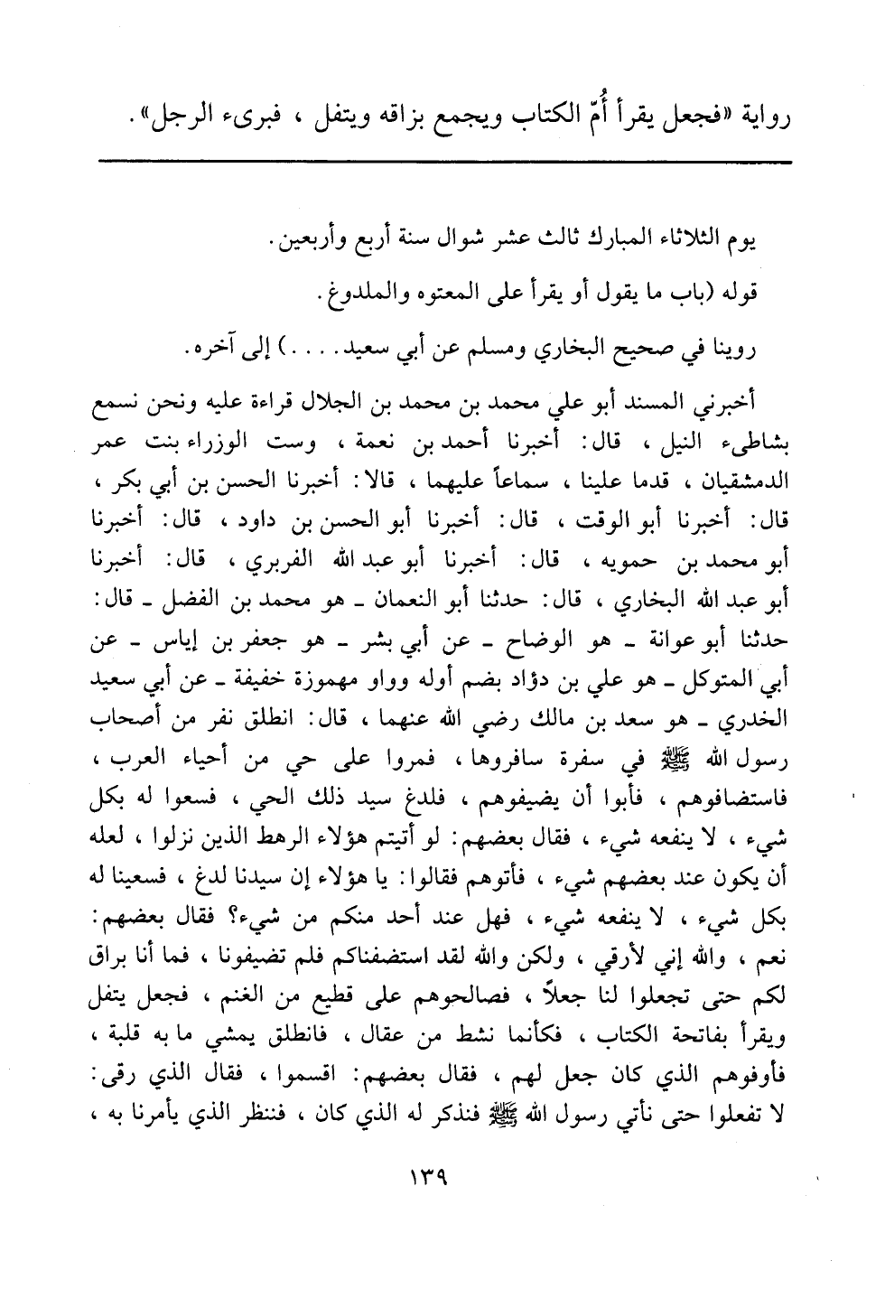 أخبرني المسند أبو علي محمد بن محمد بن الجلال قراءة عليه ونحن نسمع بشاطئ النيل، قال: أخبرنا أحمد بن نعمة، وست الوزراء بنت عمر الدمشقيان، قدما علينا، سماعاً عليهما، قالا: أخبرنا الحسن بن أبي بكر، قال: أخبرنا أبو الوقت، قال: أخبرنا أبو الحسن بن داود، قال: أخبرنا أبو محمد بن حمويه، قال: أخبرنا أبو عبد الله الفربري، قال: أخبرنا أبو عبد الله البخاري، قال: حدثنا أبو النعمان -هو محمد بن الفضل- قال: حدثنا أبو عوانة -هو الوضاح- عن أبي بشر -هو جعفر بن إياس- عن أبي المتوكل -هو علي بن دؤاد بضم أوله وواو مهموزة خفيفة- عن أبي سعيد الخدري -هو سعد بن مالك رضي الله عنهما، قال: انطلق نفر من أصحاب رسول الله صلى الله عليه وسلم في سفرة سافروها، فمروا على حي من أحياء العرب، فاستضافوهم، فأبوا أن يضيفوهم، فلدغ سيد ذلك الحي، فسعوا له بكل شيء، لا ينفعه شيء، فقال بعضهم: لو أتيتم هؤلاء الرهط الذين نزلوا، لعله أن يكون عند بعضهم شيء، فأتوهم فقالوا: يا هؤلاء إن سيدنا لدغ، فسعينا له بكل شيء، لا ينفعه شيء، فهل عند أحد منكم من شيء؟ فقال بعضهم: نعم، والله إني لأرقي، ولكن والله لقد استضفناكم فلم تضيفونا، فما أنا براق لكم حتى تجعلوا لنا جعلاً، فصالحوهم على قطيع من الغنم، فجعل يتفل ويقرأ بفاتحة الكتاب، فكأنما نشط من عقال، فانطلق يمشي ما به قلبة، فأوفوهم الذي كان جعل لهم، فقال بعضهم: اقسموا، فقال الذي رقى: لا تفعلوا حتى نأتي رسول الله صلى الله عليه وسلم فنذكر له الذي كان، فننظر الذي يأمرنا به،