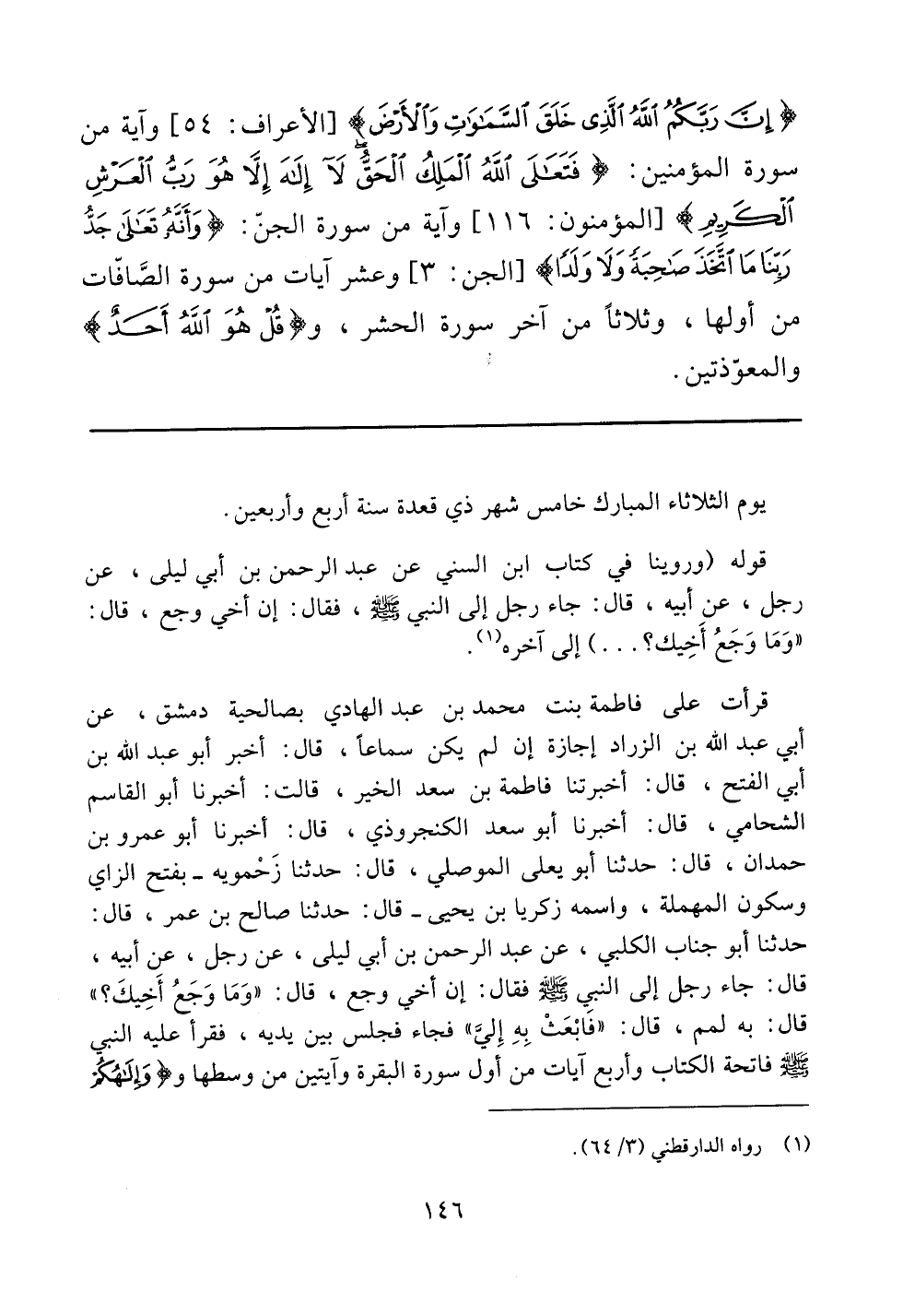 قرأت على فاطمة بنت محمد بن عبد الهادي بصالحية دمشق، عن أبي عبد الله بن الزراد إجازة إن لم يكن سماعاً، قال: أخبر أبو عبد الله بن أبي الفتح، قال: أخبرتنا فاطمة بن سعد الخير، قالت: أخبرنا أبو القاسم الشحامي، قال: أخبرنا أبو سعد الكنجروذي، قال: أخبرنا أبو عمرو بن حمدان، قال: حدثنا أبو يعلى الموصلي، قال: حدثنا زحمويه -بفتح الزاي وسكون المهملة، واسمه زكريا بن يحيى- قال: حدثنا صالح بن عمر، قال: حدثنا أبو جناب الكلبي، عن عبد الرحمن بن أبي ليلى، عن رجل، عن أبيه، قال: جاء رجل إلى النبي صلى الله عليه وسلم فقال: إن أخي وجع، قال: ((وما وجع أخيك؟)) قال: به لمم، قال: ((فابعث به إلي)) فجاء فجلس بين يديه، فقرأ عليه النبي صلى الله عليه وسلم فاتحة الكتاب وأربع آيات من أول سورة البقرة وآيتين من وسطها و{إلهاكم