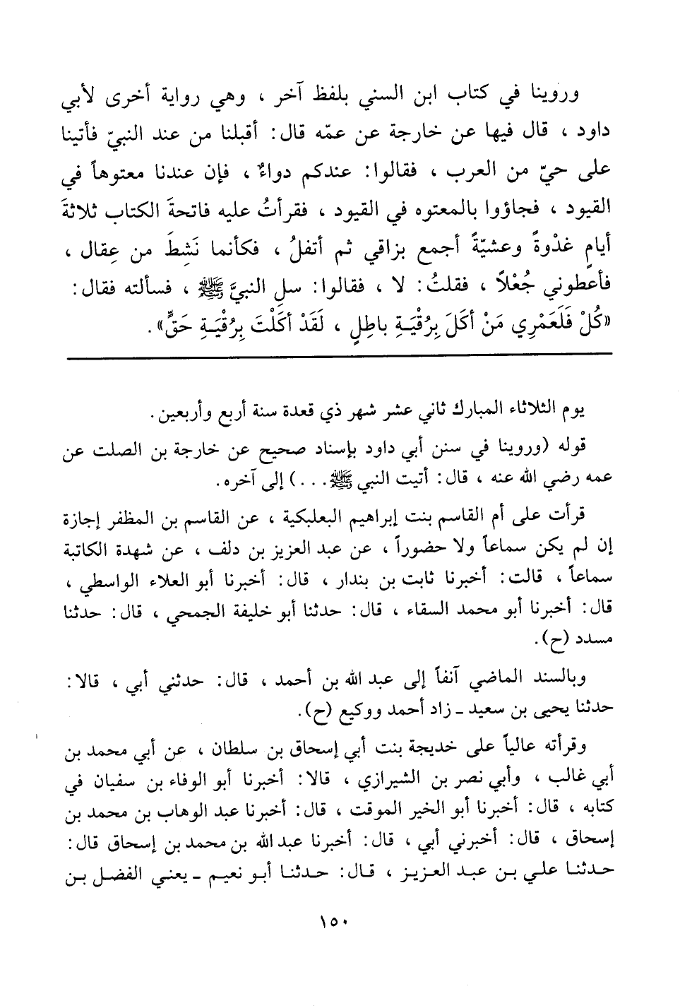 وروينا في كتاب ابن السني بلفظ آخر، وهي رواية أخرى لأبي داود، قال فيها عن خارجة عن عمه قال: أقبلنا من عند النبي فأتينا على حي من العرب، فقالوا: عندكم دواءٌ، فإن عندنا معتوهاً في القيود، فجاؤوا بالمعتوه في القيود، فقرأت عليه فاتحة الكتاب ثلاثة أيامٍ غدوةً وعشيةً أجمع بزاقي ثم أتفل، فكأنما نشط من عقال، فأعطوني جعلاً، فقلت: لا، فقالوا: سل النبي صلى الله عليه وسلم، فسألته فقال: ((كل فلعمري من أكل برقية باطلٍ، لقد أكلت برقية حق)).]]