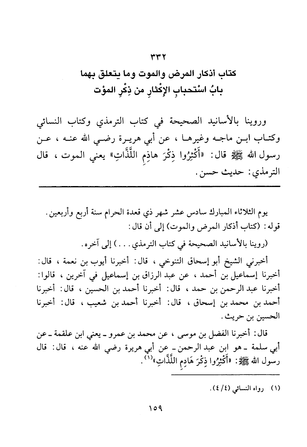 وروينا بالأسانيد الصحيحة في كتاب الترمذي وكتاب النسائي وكتاب ابن ماجه وغيرها، عن أبي هريرة رضي الله عنه، عن رسول الله صلى الله عليه وسلم قال: ((أكثروا ذكر هاذم اللذات)) يعني الموت، قال الترمذي: حديث حسن.]]