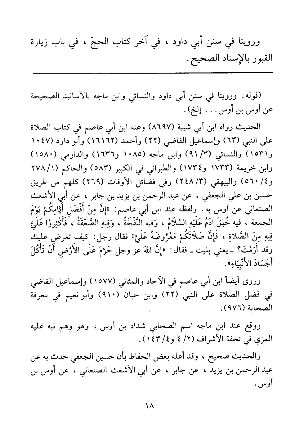 الحديث رواه ابن أبي شيبة (8697) وعنه ابن أبي عاصم في كتاب الصلاة على النبي (63) وإسماعيل القاضي (22) وأحمد (16162) وأبو داود (1047 و1531) والنسائي (3/91) وابن ماجه (1085 و1636) والدارمي (1580) وابن خزيمة (1733 و1734) والطبراني في الكبير (583) والحاكم (1/278 و4/560) والبيهقي (3/248) وفي فضائل الأوقات (269) كلهم من طريق حسين بن علي الجعفي، عن عبد الرحمن بن يزيد بن جابر، عن أبي الأشعث الصنعاني عن أوس به. ولفظه عند ابن أبي عاصم: ((إن من أفضل أيامكم يوم الجمعة، فيه خلق آدم عليه السلام، وفيه النفخة، وفيه الصعقة، فأكثروا علي فيه من الصلاة، فإن صلاتكم معروضةٌ علي)) فقال رجل: كيف تعرض عليك وقد أرمت)) -يعني بليت- فقال: ((إن الله عز وجل حرم على الأرض أن تأكل أجساد الأنبياء)).
