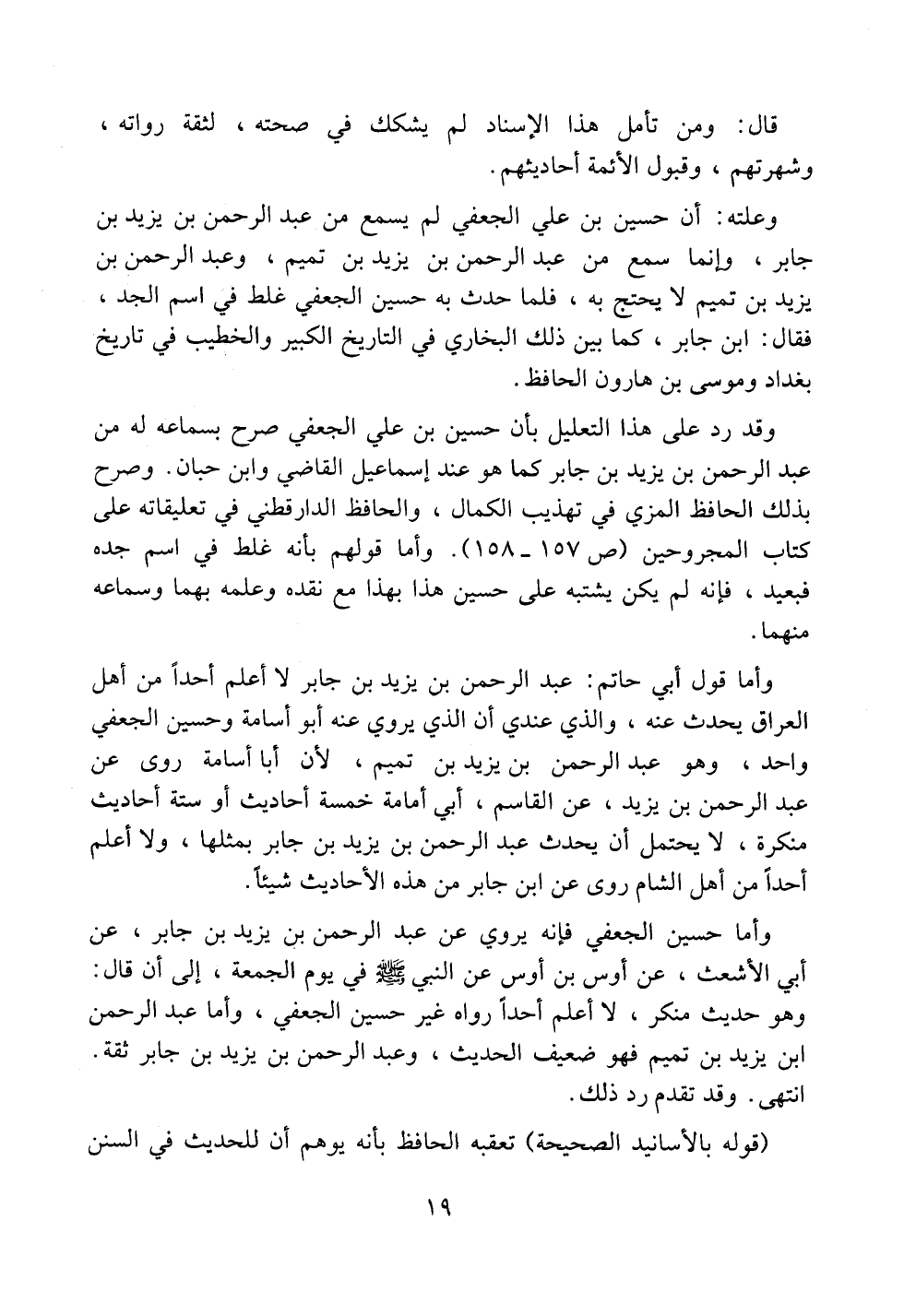 وأما حسين الجعفي فإنه يروي عن عبد الرحمن بن يزيد بن جابر، عن أبي الأشعث، عن أوس بن أوس عن النبي صلى الله عليه وسلم في يوم الجمعة، إلى أن قال: وهو حديث منكر، لا أعلم أحداً رواه غير حسين الجعفي، وأما عبد الرحمن ابن يزيد بن تميم فهو ضعيف الحديث، وعبد الرحمن بن يزيد بن جابر ثقة. انتهى. وقد تقدم رد ذلك.