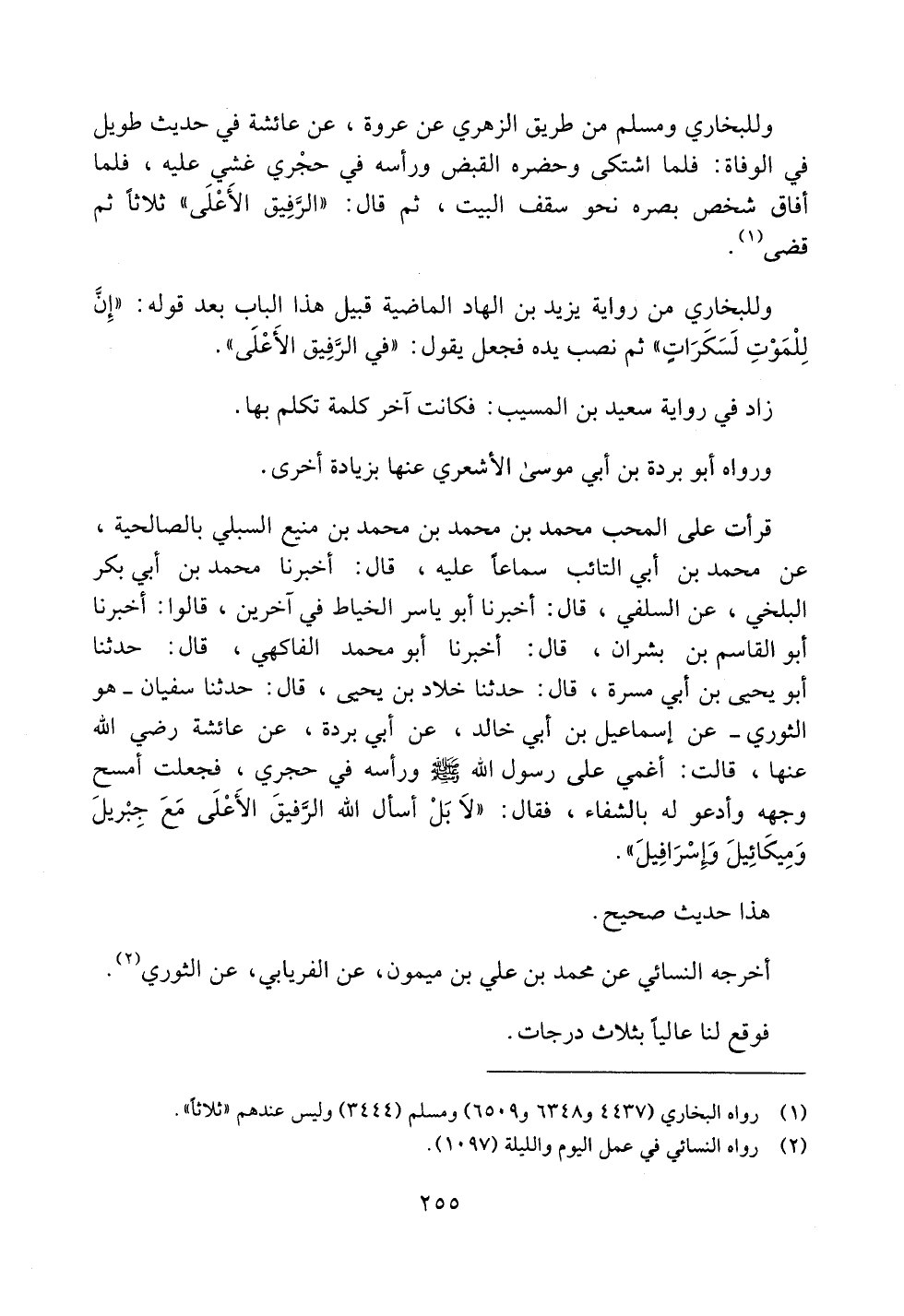 قرأت على المحب محمد بن محمد بن محمد بن منيع السبلي بالصالحية، عن محمد بن أبي التائب سماعاً عليه، قال: أخبرنا محمد بن أبي بكر البلخي، عن السلفي، قال: أخبرنا أبو ياسر الخياط في آخرين، قالوا: أخبرنا أبو القاسم بن بشران، قال: أخبرنا أبو محمد الفاكهي، قال: حدثنا أبو يحيى بن أبي مسرة، قال: حدثنا خلاد بن يحيى، قال: حدثنا سفيان -هو الثوري- عن إسماعيل بن أبي خالد، عن أبي بردة، عن عائشة رضي الله عنها، قالت: أغمي على رسول الله صلى الله عليه وسلم ورأسه في حجري، فجعلت أمسح وجهه وأدعو له بالشفاء، فقال: ((لا بل أسأل الله الرفيق الأعلى مع جبريل وميكائيل وإسرافيل)).