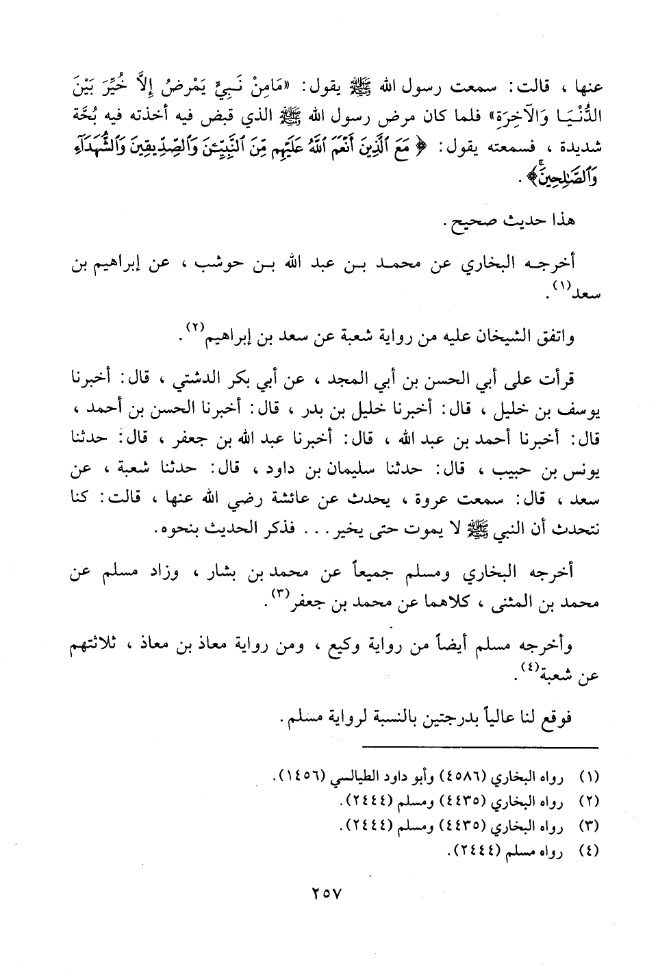 عنها، قالت: سمعت رسول الله صلى الله عليه وسلم يقول: ((ما من نبي يمرض إلا خير بين الدنيا والآخرة)) فلما كان مرض رسول الله صلى الله عليه وسلم الذي قبض فيه أخذته فيه بحة شديدة، فسمعته يقول: {مع الذين أنعم الله عليهم من النبيين والصديقين والشهداء والصالحين}.