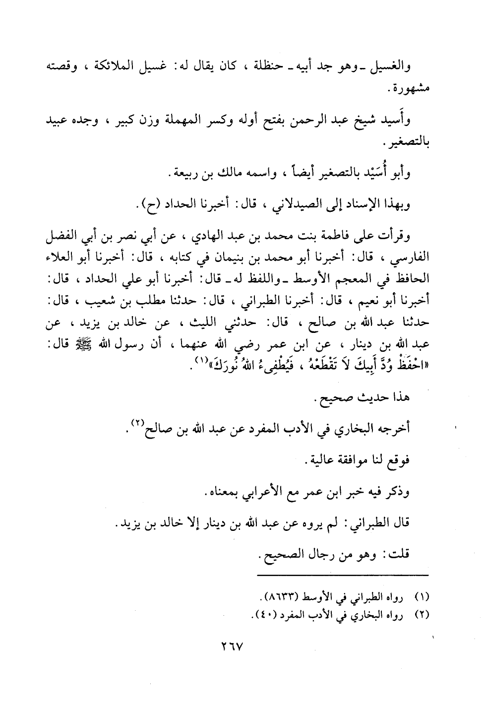 وقرأت على فاطمة بنت محمد بن عبد الهادي، عن أبي نصر بن أبي الفضل الفارسي، قال: أخبرنا أبو محمد بن بنيمان في كتابه، قال: أخبرنا أبو العلاء الحافظ في المعجم الأوسط -واللفظ له- قال: أخبرنا أبو علي الحداد، قال: أخبرنا أبو نعيم، قال: أخبرنا الطبراني، قال: حدثنا مطلب بن شعيب، قال: حدثنا عبد الله بن صالح، قال: حدثني الليث، عن خالد بن يزيد، عن عبد الله بن دينار، عن ابن عمر رضي الله عنهما، أن رسول الله صلى الله عليه وسلم قال: ((احفظ ود أبيك لا تقطعه، فيطفئ الله نورك)).