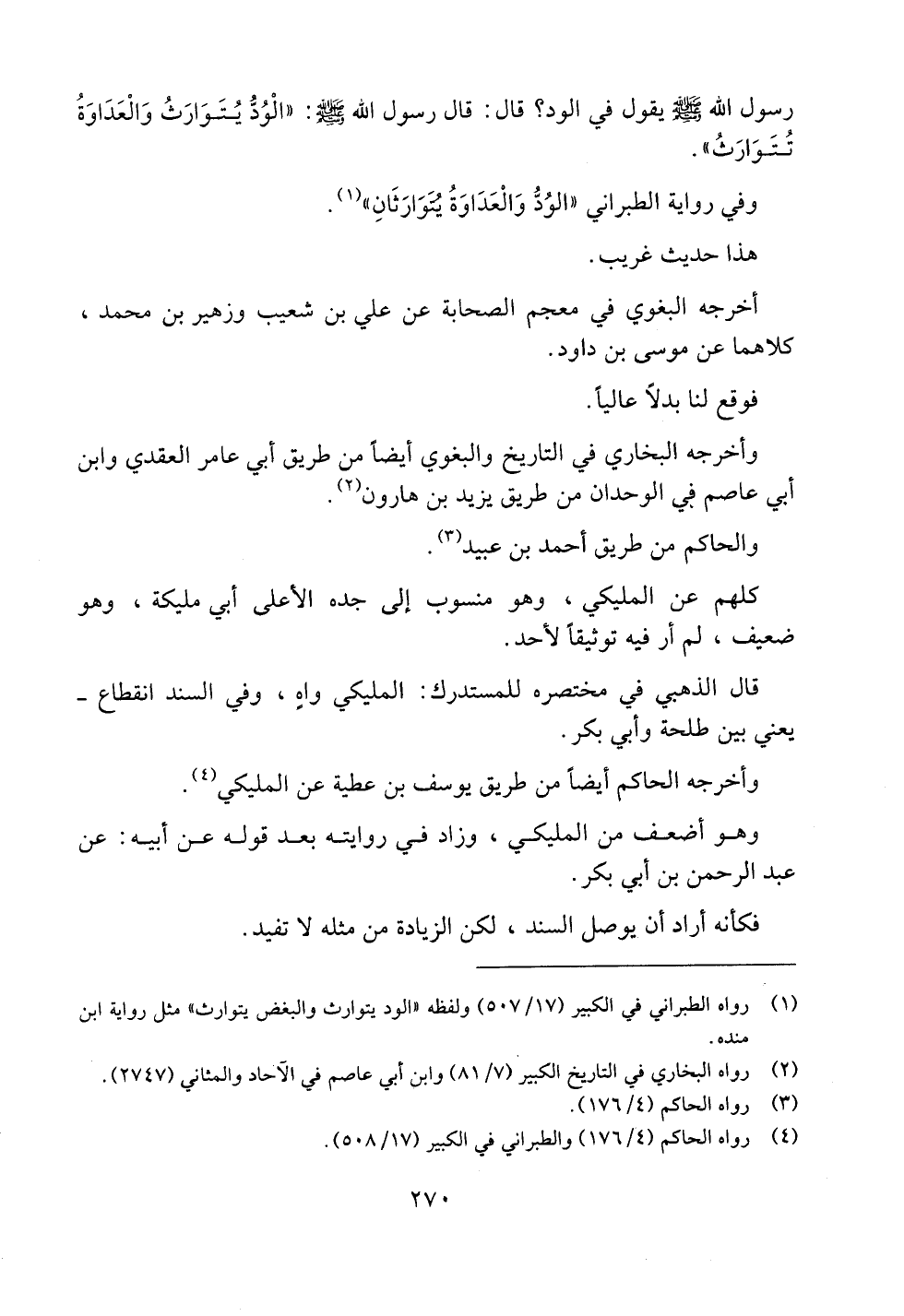 وفي رواية الطبراني ((الود والعداوة يتوارثان)).