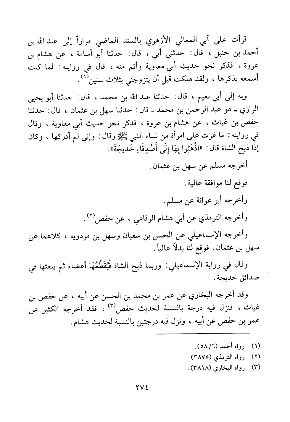 قرأت على أبي المعالي الأزهري بالسند الماضي مراراً إلى عبد الله بن أحمد بن حنبل، قال: حدثني أبي، قال: حدثنا أبو أسامة، عن هشام بن عروة، فذكر نحو حديث أبي معاوية وأتم منه، قال في روايته: لما كنت أسمعه يذكرها، ولقد هلكت قبل أن يتزوجني بثلاث سنين.