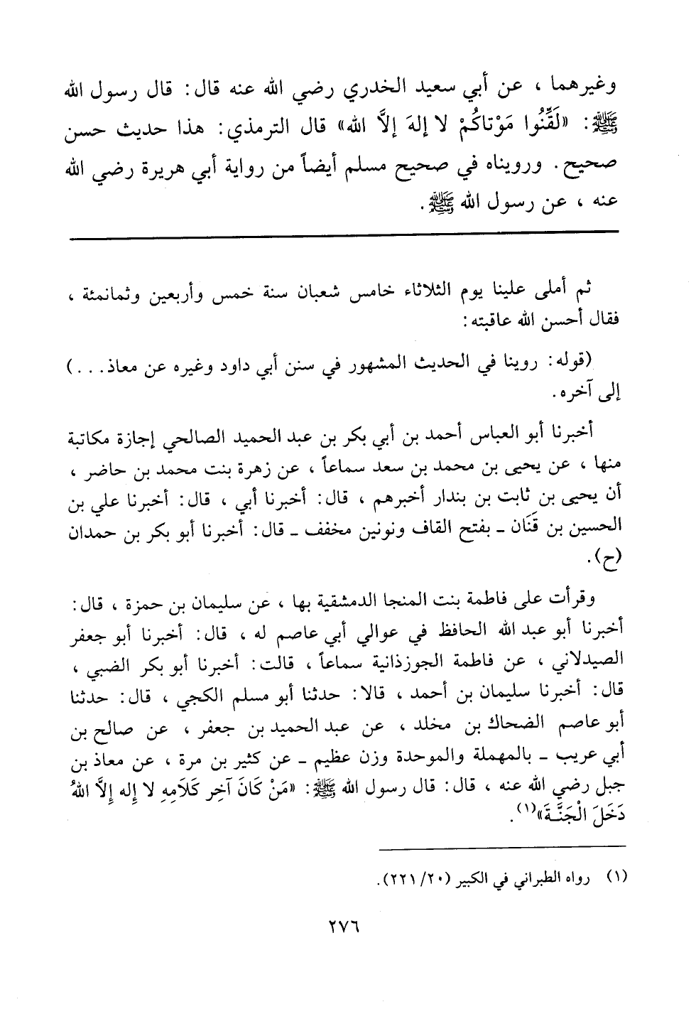 وقرأت على فاطمة بنت المنجا الدمشقية بها، عن سليمان بن حمزة، قال: أخبرنا أبو عبد الله الحافظ في عوالي أبي عاصم له، قال: أخبرنا أبو جعفر الصيدلاني، عن فاطمة الجوزذانية سماعاً، قالت: أخبرنا أبو بكر الضبي، قال: أخبرنا سليمان بن أحمد، قالا: حدثنا أبو مسلم الكجي، قال: حدثنا أبو عاصم الضحاك بن مخلد، عن عبد الحميد بن جعفر، عن صالح بن أبي عريب -بالمهملة والموحدة وزن عظيم- عن كثير بن مرة، عن معاذ بن جبل رضي الله عنه، قال: قال رسول الله صلى الله عليه وسلم: ((من كان آخر كلامه لا إله إلا الله دخل الجنة)).