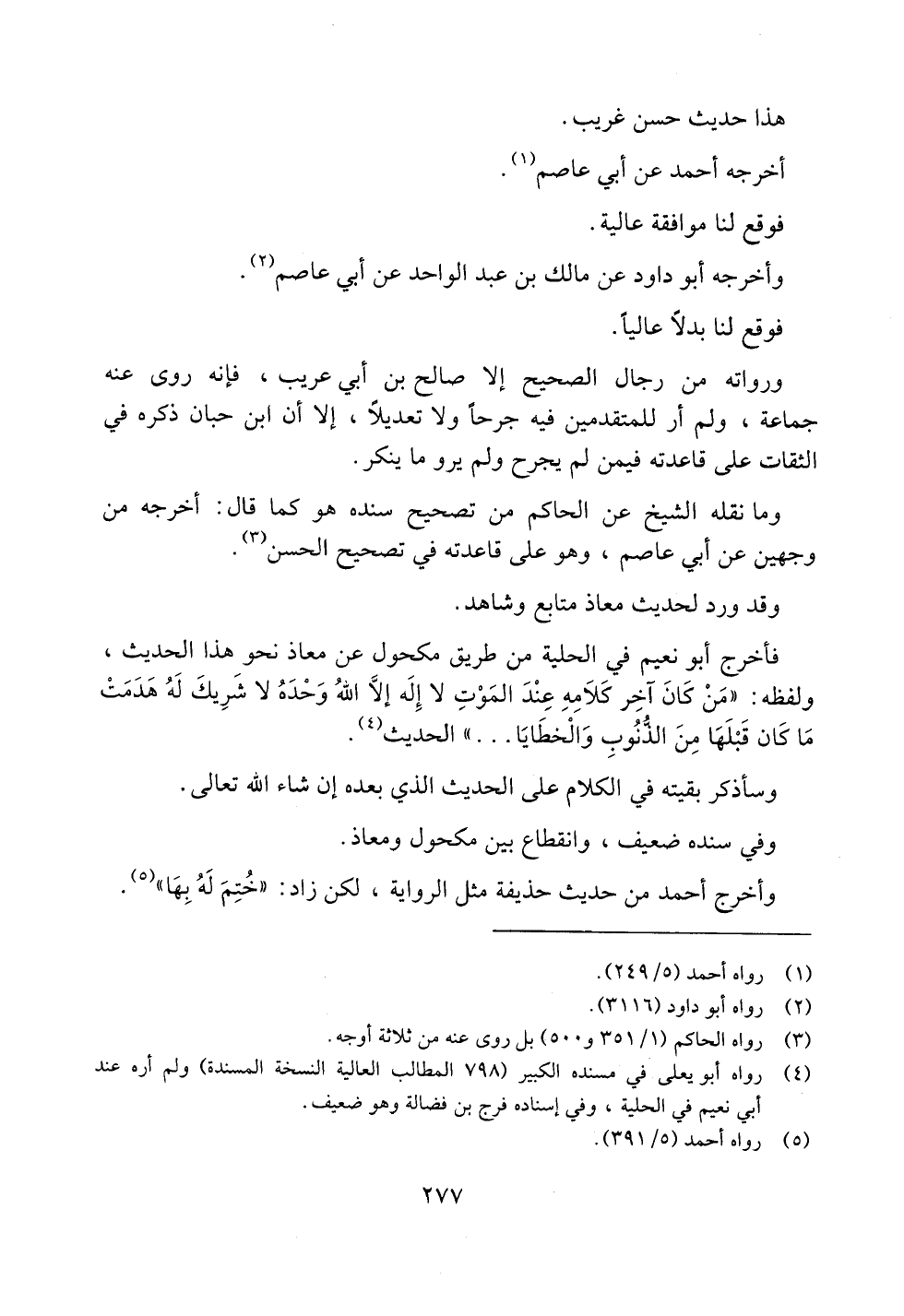 فأخرج أبو نعيم في الحلية من طريق مكحول عن معاذ نحو هذا الحديث، ولفظه: ((من كان آخر كلامه عند الموت لا إله إلا الله وحده لا شريك له هدمت ما كان قبلها من الذنوب والخطايا ..)) الحديث.