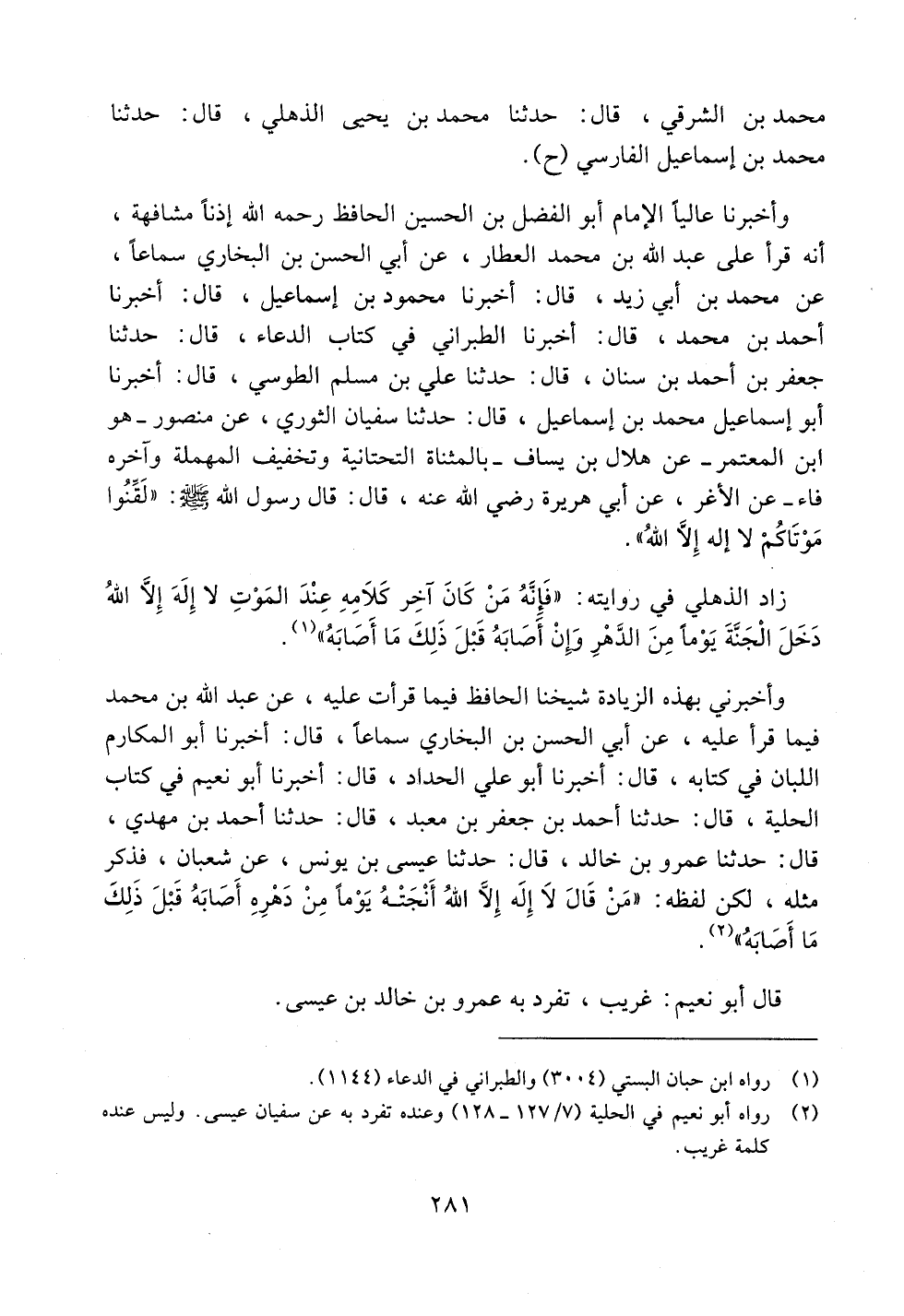 وأخبرني بهذه الزيادة شيخنا الحافظ فيما قرأت عليه، عن عبد الله بن محمد فيما قرأ عليه، عن أبي الحسن بن البخاري سماعاً، قال: أخبرنا أبو المكارم اللبان في كتابه، قال: أخبرنا أبو علي الحداد، قال: أخبرنا أبو نعيم في كتاب الحلية، قال: حدثنا أحمد بن جعفر بن معبد، قال: حدثنا أحمد بن مهدي، قال: حدثنا عمرو بن خالد، قال: حدثنا عيسى بن يونس، عن شعبان، فذكر مثله، لكن لفظه: ((من قال لا إله إلا الله أنجته يوماً من دهره أصابه قبل ذلك ما أصابه)).