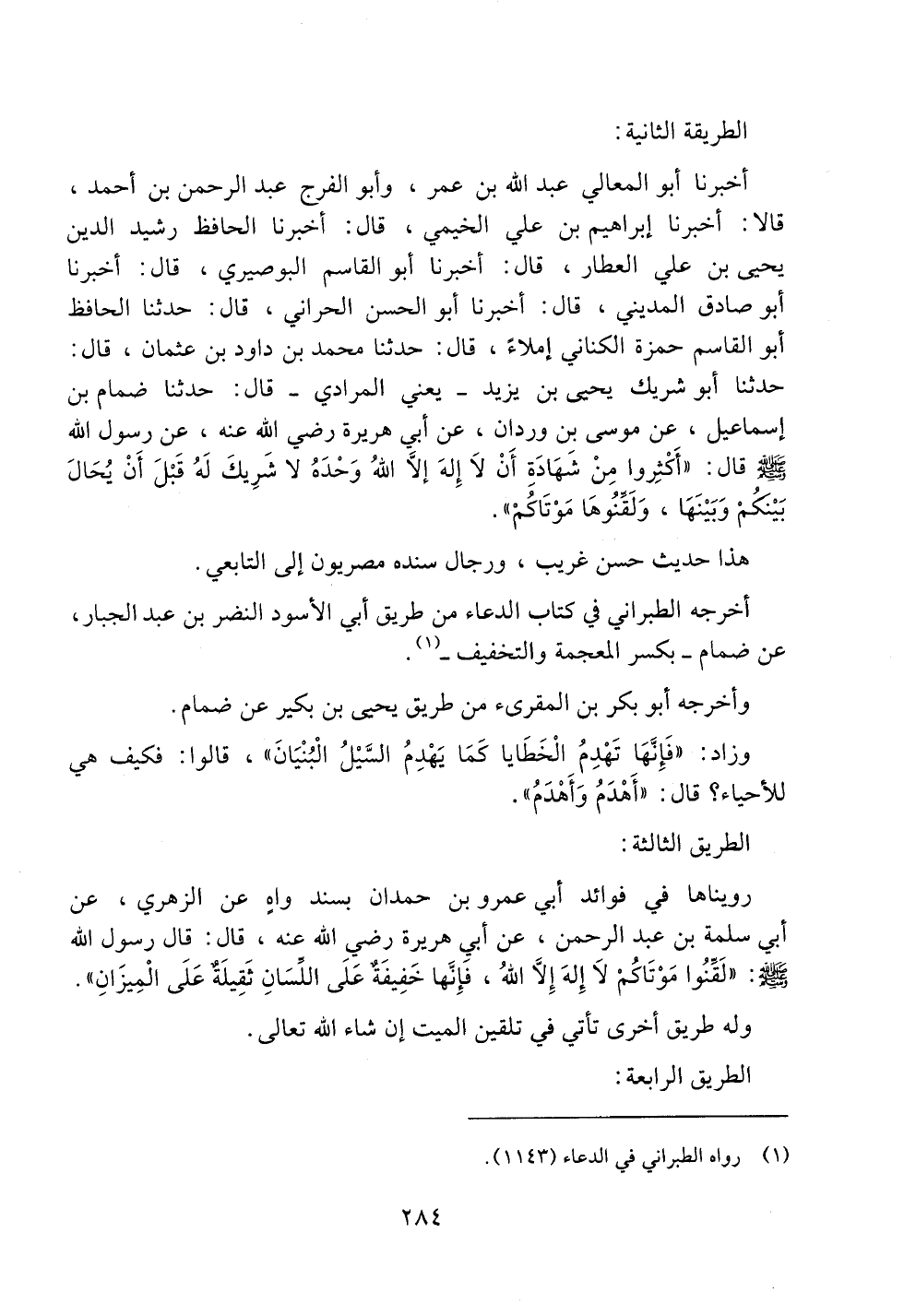 أخبرنا أبو المعالي عبد الله بن عمر، وأبو الفرج عبد الرحمن بن أحمد، قالا: أخبرنا إبراهيم بن علي الخيمي، قال: أخبرنا الحافظ رشيد الدين يحيى بن علي العطار، قال: أخبرنا أبو القاسم البوصيري، قال: أخبرنا أبو صادق المديني، قال: أخبرنا أبو الحسن الحراني، قال: حدثنا الحافظ أبو القاسم حمزة الكناني إملاءً، قال: حدثنا محمد بن داود بن عثمان، قال: حدثنا أبو شريك يحيى بن يزيد -يعني المرادي- قال: حدثنا ضمام بن إسماعيل، عن موسى بن وردان، عن أبي هريرة رضي الله عنه، عن رسول الله صلى الله عليه وسلم قال: ((أكثروا من شهادة أن لا إله إلا الله وحده لا شريك له قبل أن يحال بينكم وبينها، ولقنوها موتاكم)).