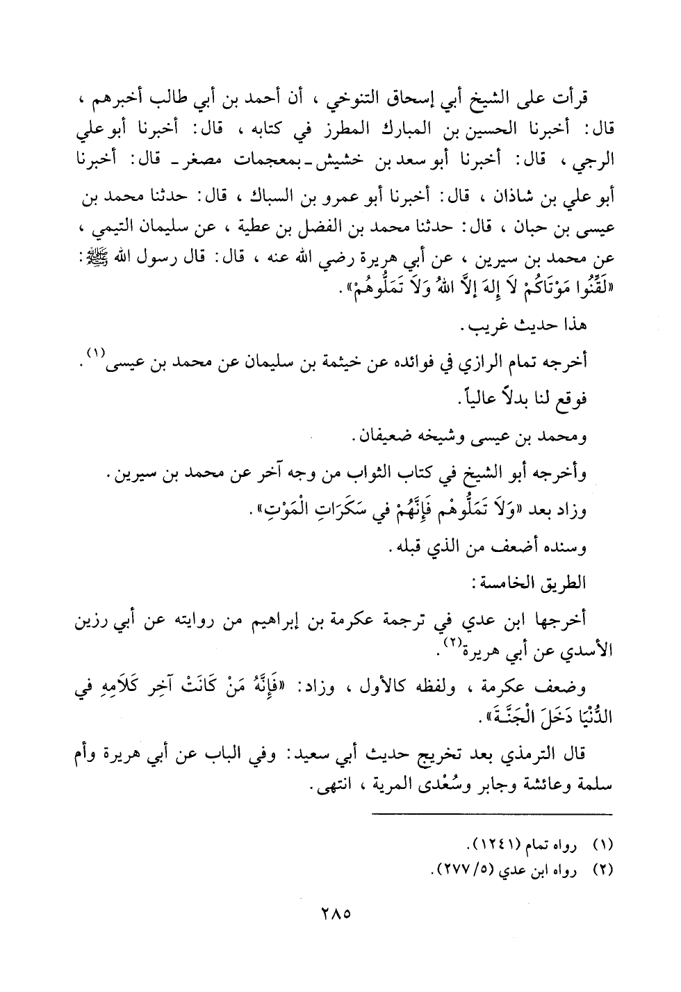 قرأت على الشيخ أبي إسحاق التنوخي، أن أحمد بن أبي طالب أخبرهم، قال: أخبرنا الحسين بن المبارك المطرز في كتابه، قال: أخبرنا أبو علي الرجي، قال: أخبرنا أبو سعد بن خشيش -بمعجمات مصغر- قال: أخبرنا أبوعلي بن شاذان، قال: أخبرنا أبو عمرو بن السباك، قال: حدثنا محمد بن عيسى بن حبان، قال: حدثنا محمد بن الفضل بن عطية، عن سليمان التيمي، عن محمد بن سيرين، عن أبي هريرة رضي الله عنه، قال: قال رسول الله صلى الله عليه وسلم: ((لقنوا موتاكم لا إله إلا الله ولا تملوهم)).