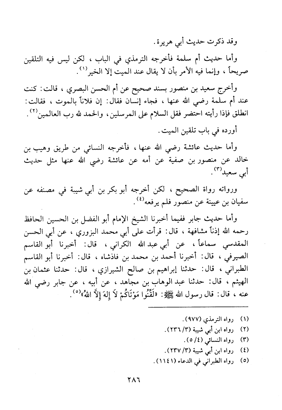 وأما حديث أم سلمة فأخرجه الترمذي في الباب، لكن ليس فيه التلقين صريحاً، وإنما فيه الأمر بأن لا يقال عند الميت إلا الخير.