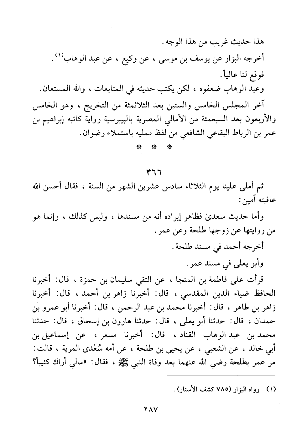 قرأت على فاطمة بن المنجا، عن التقي سليمان بن حمزة، قال: أخبرنا الحافظ ضياء الدين المقدسي، قال: أخبرنا زاهر بن أحمد، قال: أخبرنا زاهر بن طاهر، قال: أخبرنا محمد بن عبد الرحمن، قال: أخبرنا أبو عمرو بن حمدان، قال: حدثنا أبو يعلى، قال: حدثنا هارون بن إسحاق، قال: حدثنا محمد بن عبد الوهاب القناد، قال: أخبرنا مسعر، عن إسماعيل بن أبي خالد، عن الشعبي، عن يحيى بن طلحة، عن أمه سعدى المرية، قالت: مر عمر بطلحة رضي الله عنهما بعد وفاة النبي صلى الله عليه وسلم، فقال: ((مالي أراك كئيباً؟