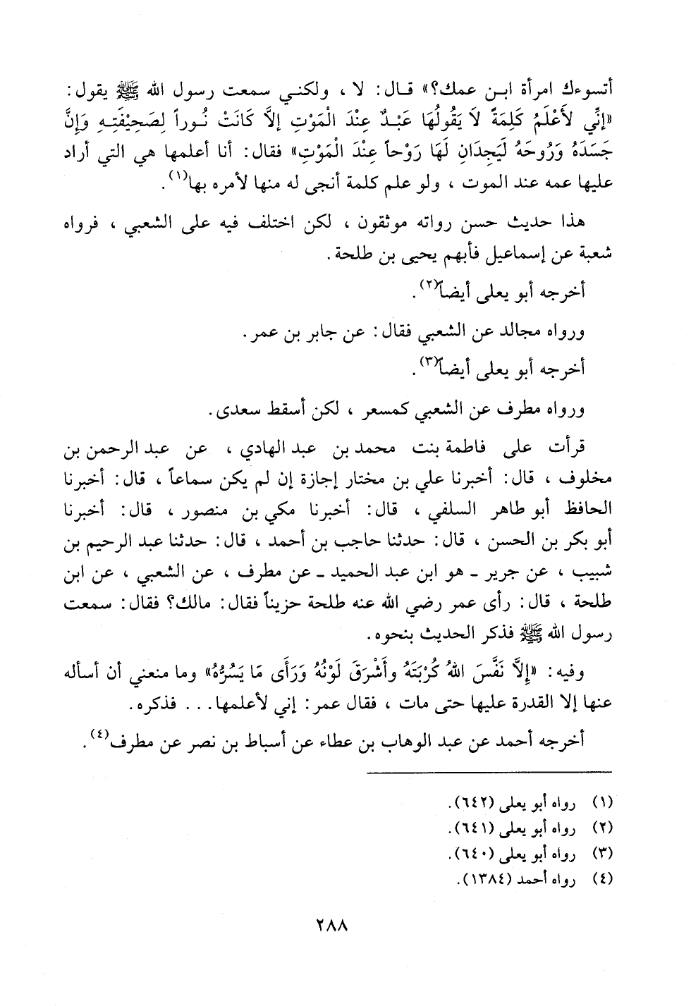 أتسوءك امرأة ابن عمك؟)) قال: لا، ولكني سمعت رسول الله صلى الله عليه وسلم يقول: ((إني لأعلم كلمةً لا يقولها عبدٌ عند الموت إلا كانت نوراً لصحيفته وإن جسده وروحه ليجدان لها روحاً عند الموت)) فقال: أنا أعلمها هي التي أراد عليها عمه عند الموت، ولو علم كلمة أنجى له منها لأمره بها.