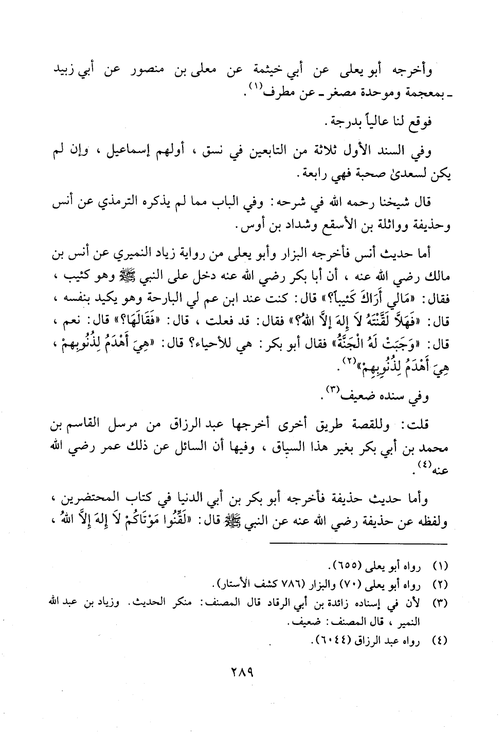 أما حديث أنس فأخرجه البزار وأبو يعلى من رواية زياد النميري عن أنس بن مالك رضي الله عنه، أن أبا بكر رضي الله عنه دخل على النبي صلى الله عليه وسلم وهو كئيب، فقال: ((مالي أراك كئيباً؟ قال: كنت عند ابن عم لي البارحة وهو يكيد بنفسه، قال: ((فهلا لقنته لا إله إلا الله؟)) فقال: قد فعلت، قال: ((فقالها؟)) قال: نعم، قال: ((وجبت له الجنة)) فقال أبو بكر: هي للأحياء؟ قال: ((هي أهدم لذنوبهم، هي أهدم لذنوبهم)).
