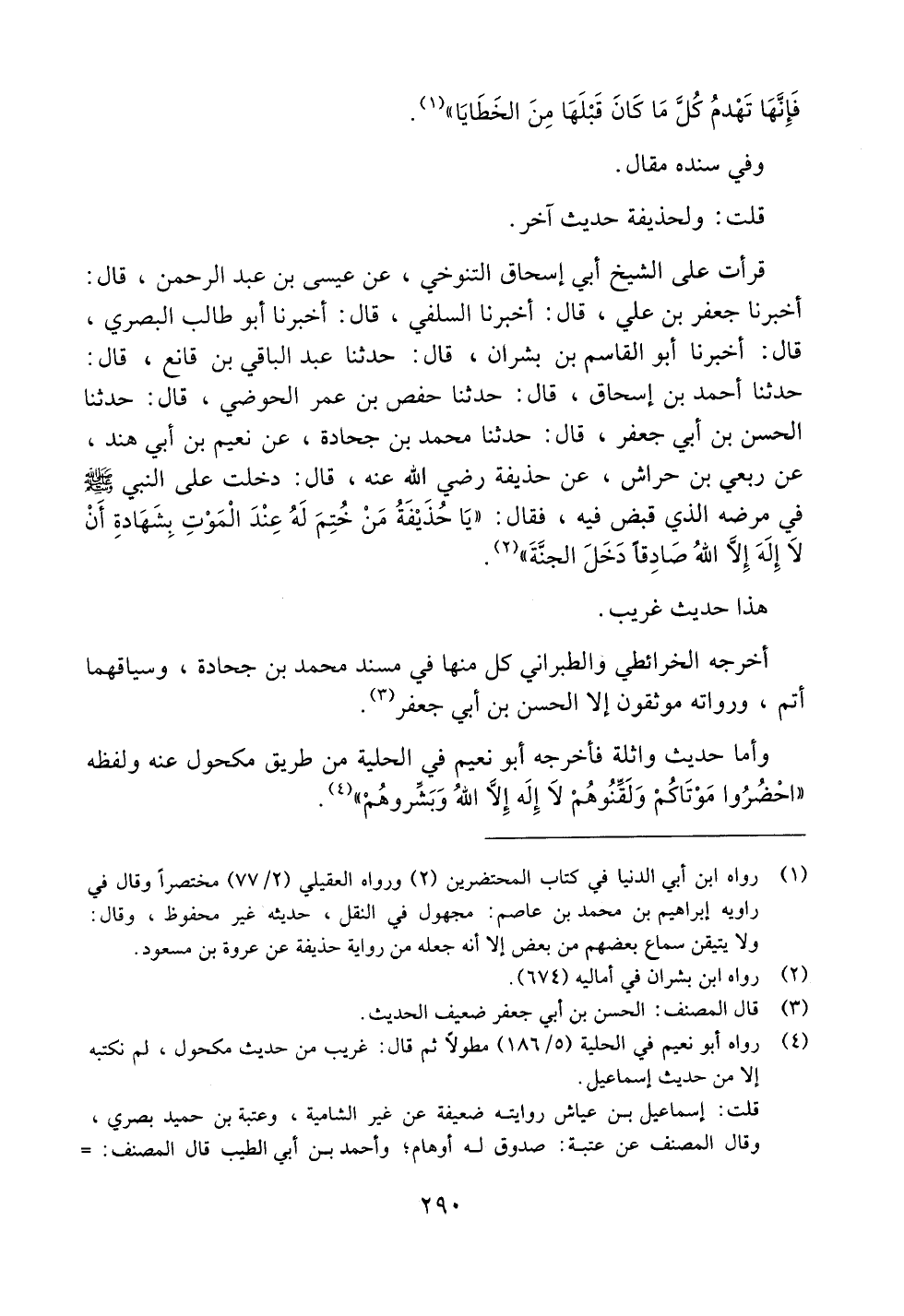 قرأت على الشيخ أبي إسحاق التنوخي، عن عيسى بن عبد الرحمن، قال: أخبرنا جعفر بن علي، قال: أخبرنا السلفي، قال: أخبرنا أبو طالب البصري، قال: أخبرنا أبو القاسم بن بشران، قال: حدثنا عبد الباقي بن قانع، قال: حدثنا أحمد بن إسحاق، قال: حدثنا حفص بن عمر الحوضي، قال: حدثنا الحسن بن أبي جعفر، قال: حدثنا محمد بن جحادة، عن نعيم بن أبي هند، عن ربعي بن حراش، عن حذيفة رضي الله عنه، قال: دخلت على النبي صلى الله عليه وسلم في مرضه الذي قبض فيه، فقال: ((يا حذيفة من ختم له عند الموت بشهادة أن لا إله إلا الله صادقاً دخل الجنة)).