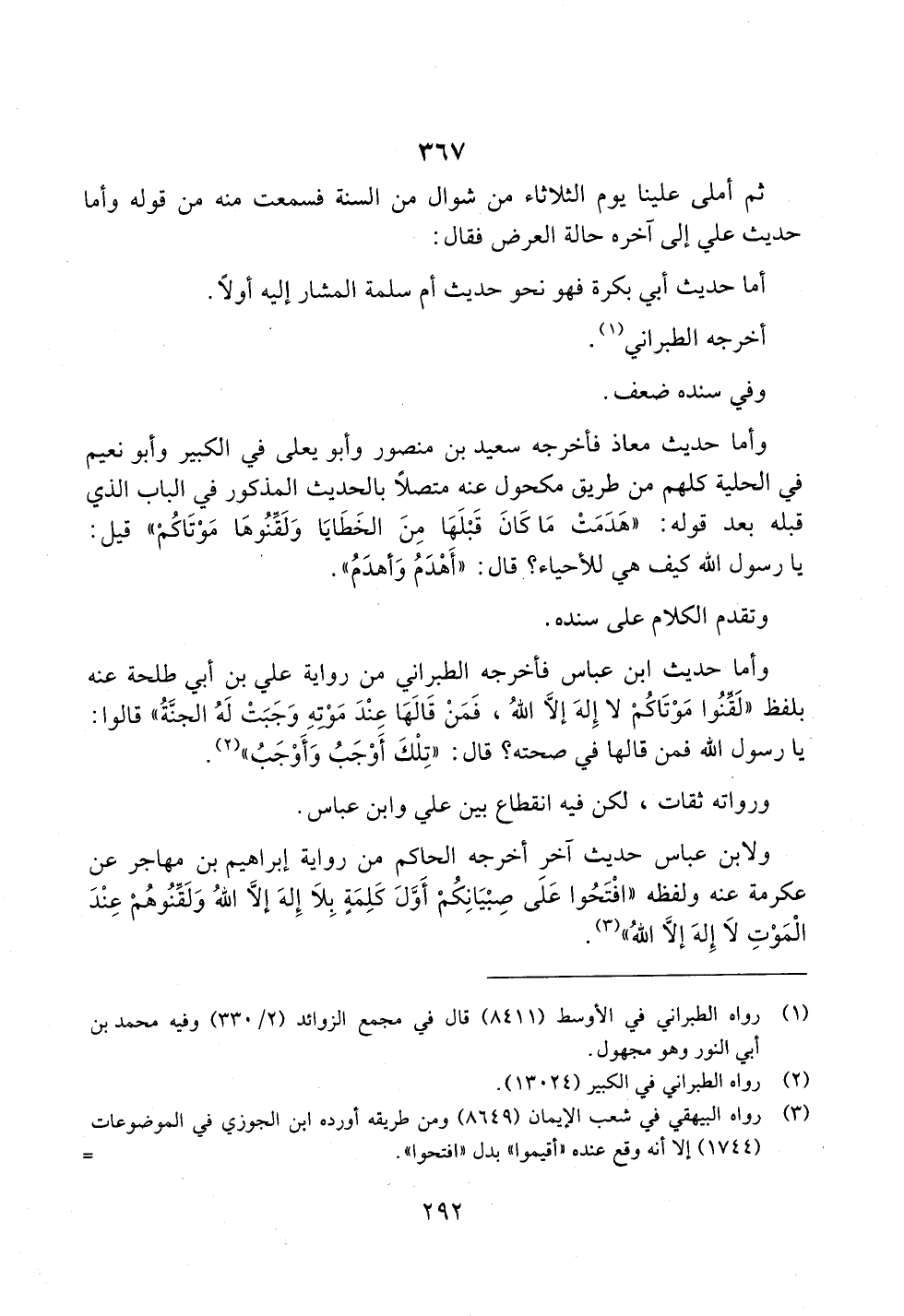 وأما حديث ابن عباس فأخرجه الطبراني من رواية علي بن أبي طلحة عنه بلفظ ((لقنوا موتاكم لا إله إلا الله، فمن قالها عند موته وجبت له الجنة)) قالوا: يا رسول الله فمن قالها في صحته؟ قال: ((تلك أوجب وأوجب)).