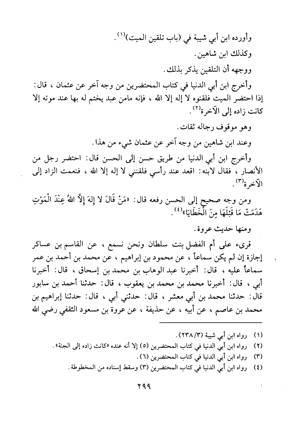 وأخرج ابن أبي الدنيا في كتاب المحتضرين من وجه آخر عن عثمان، قال: إذا احتضر الميت فلقنوه لا إله إلا الله، فإنه ما من عبد يختم له بها عند موته إلا كانت زاده إلى الآخرة.