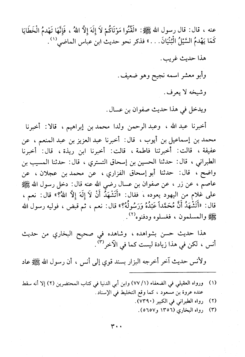 أخبرنا عبد الله، وعبد الرحمن ولدا محمد بن إبراهيم، قالا: أخبرنا محمد بن إسماعيل بن أيوب، قال: أخبرنا عبد العزيز بن عبد المنعم، عن عفيفة، قالت: أخبرتنا فاطمة، قالت: أخبرنا ابن ريذة، قال: أخبرنا الطبراني، قال: حدثنا الحسين بن إسحاق التستري، قال: حدثنا المسيب بن واضح، قال: حدثنا أبو إسحاق الفزاري، عن محمد بن عجلان، عن عاصم، عن زر، عن صفوان بن عسال رضي الله عنه قال: دخل رسول الله صلى الله عليه وسلم على غلام من اليهود يعوده، فقال: ((أتشهد أن لا إله إلا الله؟)) قال: نعم، قال: ((أتشهد أن محمداً عبده ورسوله؟)) قال: نعم، ثم قبض، فوليه رسول الله صلى الله عليه وسلم والمسلمون، فغسلوه ودفنوه.