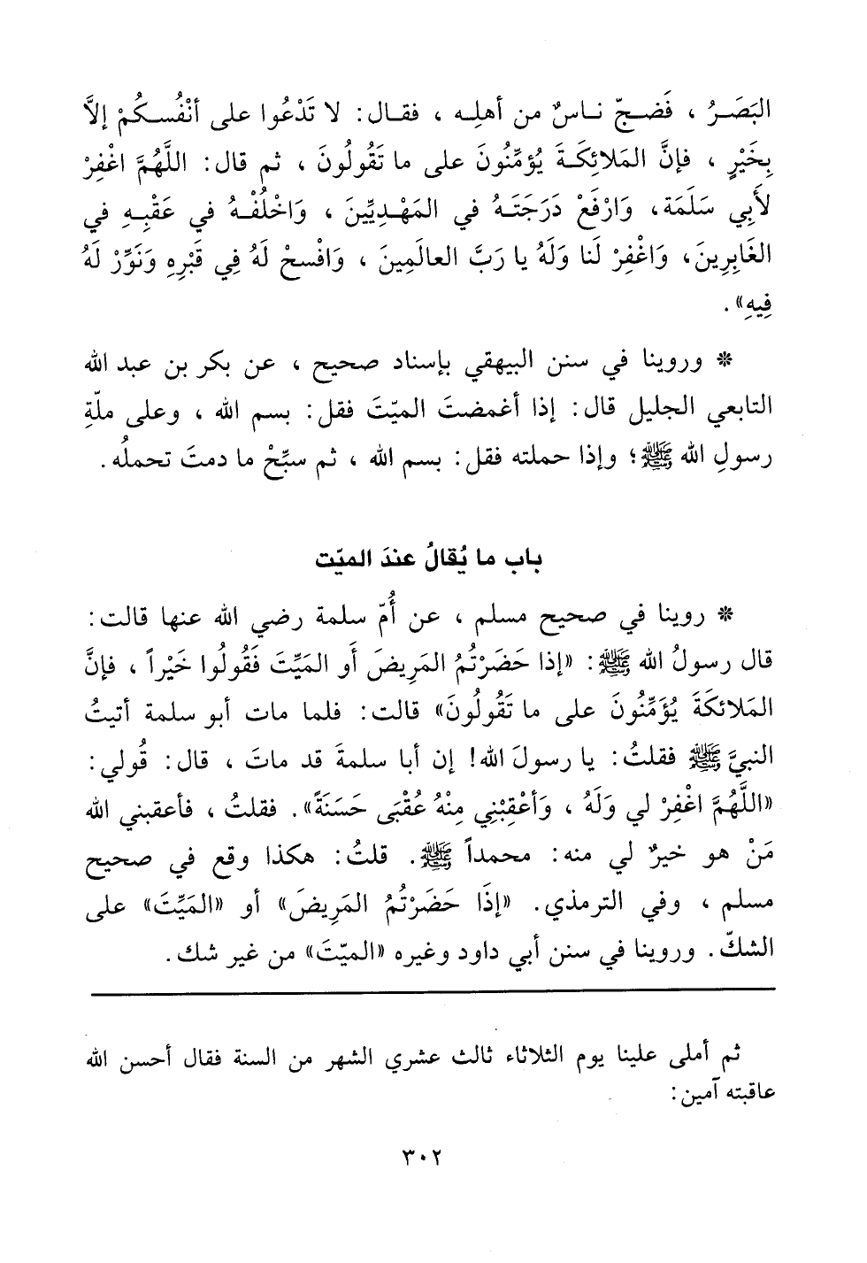 روينا في صحيح مسلم، عن أم سلمة رضي الله عنها قالت: قال رسول الله صلى الله عليه وسلم: ((إذا حضرتم المريض أو الميت فقولوا خيراً، فإن الملائكة يؤمنون على ما تقولون)) قالت: فلما مات أبو سلمة أتيت النبي صلى الله عليه وسلم فقلت: يا رسول الله! إن أبا سلمة قد مات، قال: قولي: ((اللهم اغفر لي وله، وأعقبني منه عقبى حسنةً)). فقلت: فأعقبني الله من هو خيرٌ لي منه: محمداً صلى الله عليه وسلم. قلت: هكذا وقع في صحيح مسلم، وفي الترمذي. ((إذا حضرتم المريض أو ((الميت)) على الشك. وروينا في سنن أبي داود وغيره ((الميت)) من غير شك.]]