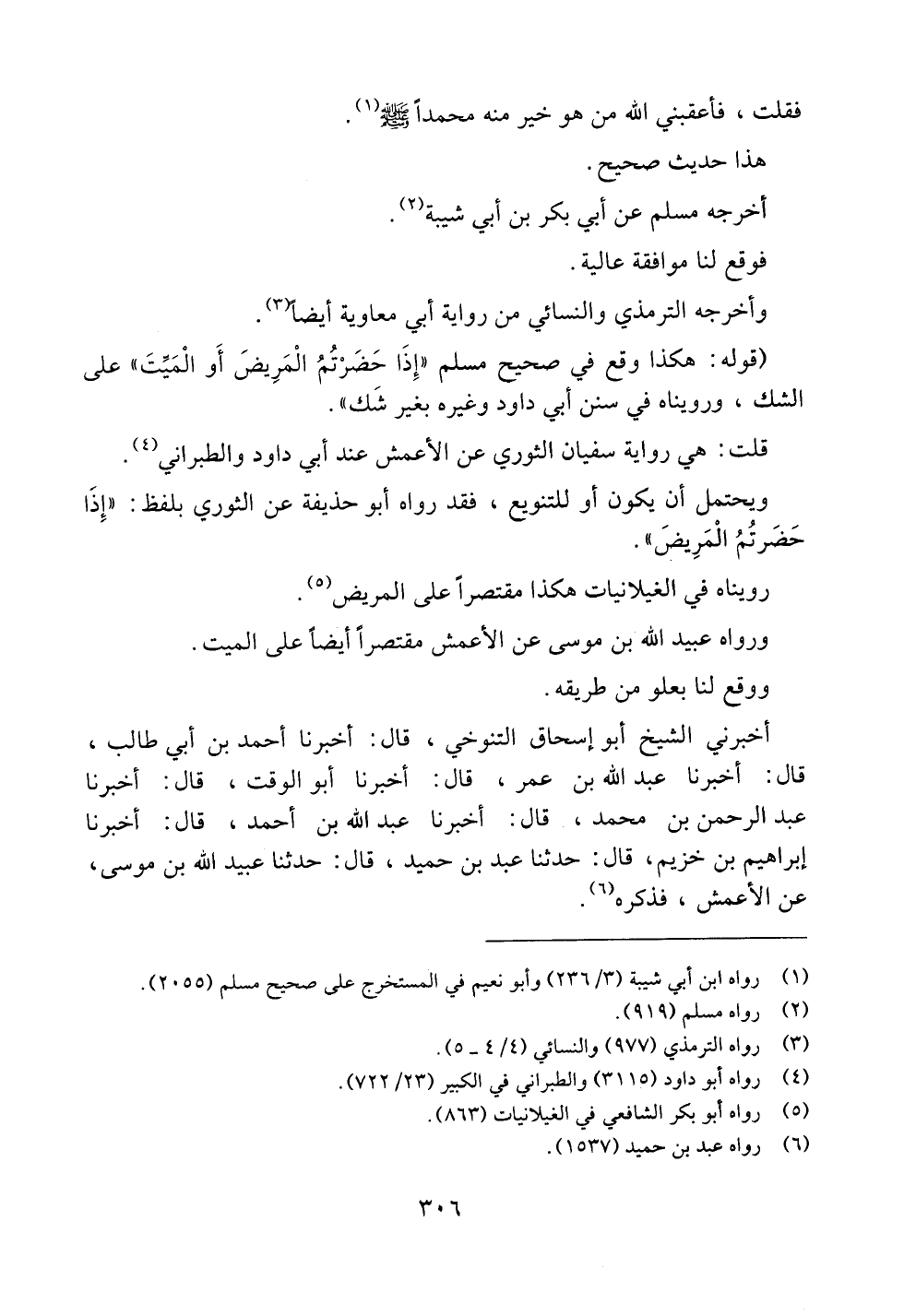 (قوله: هكذا وقع في صحيح مسلم ((إذا حضرتم المريض أو الميت)) على الشك، ورويناه في سنن أبي داود وغيره بغير شك)).