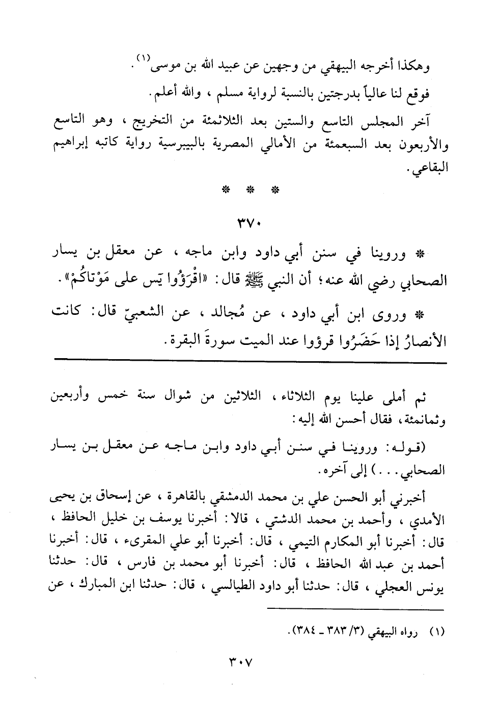 آخر المجلس التاسع والستين بعد الثلاثمئة من التخريج، وهو التاسع والأربعون بعد السبعمئة من الأمالي المصرية بالبيبرسية رواية كاتبه إبراهيم البقاعي.