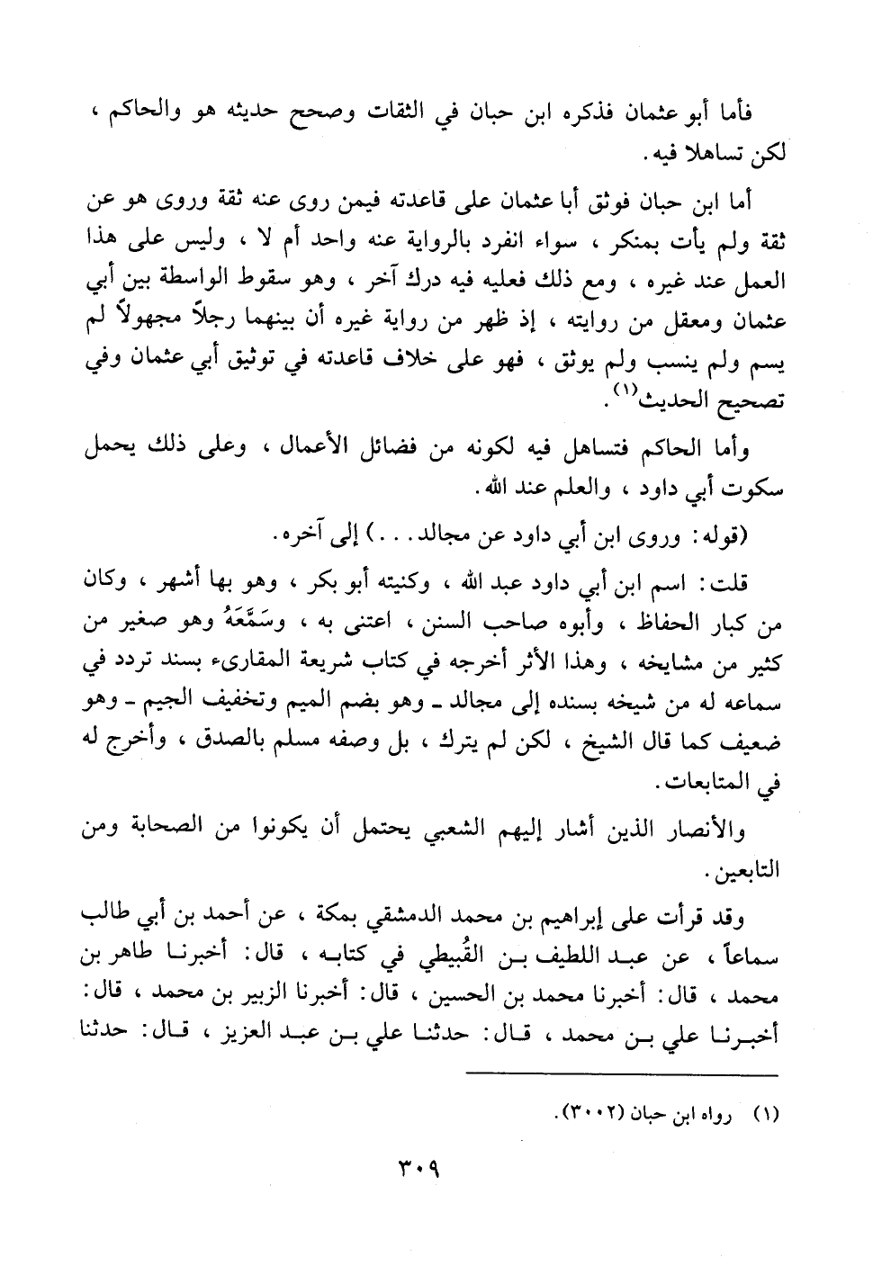 أما ابن حبان فوثق أبا عثمان على قاعدته فيمن روى عنه ثقة وروى هو عن ثقة ولم يأت بمنكر، سواء انفرد بالرواية عنه واحد أم لا، وليس على هذا العمل عند غيره، ومع ذلك فعليه فيه درك آخر، وهو سقوط الواسطة بين أبي عثمان ومعقل من روايته، إذ ظهر من رواية غيره أن بينهما رجلاً مجهولاً لم يسم ولم ينسب ولم يوثق، فهو على خلاف قاعدته في توثيق أبي عثمان وفي تصحيح الحديث.