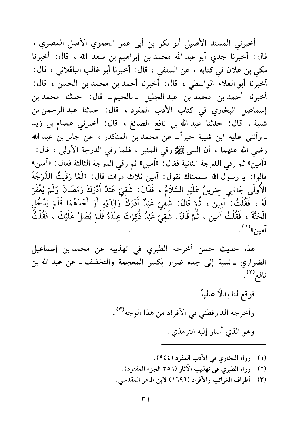 أخبرني المسند الأصيل أبو بكر بن أبي عمر الحموي الأصل المصري، قال: أخبرنا جدي أبو عبد الله محمد بن إبراهيم بن سعد الله، قال: أخبرنا مكي بن علان في كتابه، عن السلفي، قال: أخبرنا أبو غالب الباقلاني، قال: أخبرنا أبو العلاء الواسطي، قال: أخبرنا أحمد بن محمد بن الحسن، قال: أخبرنا أحمد بن محمد بن عبد الجليل -بالجيم- قال: حدثنا محمد بن إسماعيل البخاري في كتاب الأدب المفرد، قال: حدثنا عبد الرحمن بن شيبة، قال: حدثنا عبد الله بن نافع الصائغ، قال: أخبرني عصام بن زيد -وأثنى عليه ابن شيبة خيراً- عن محمد بن المنكدر، عن جابر بن عبد الله رضي الله عنهما، أن النبي صلى الله عليه وسلم رقي المنبر، فلما رقي الدرجة الأولى، قال: ((آمين)) ثم رقي الدرجة الثانية فقال: ((آمين)) ثم رقي الدرجة الثالثة فقال: ((آمين)) قالوا: يا رسول الله سمعناك تقول: آمين ثلاث مرات قال: ((لما رقيت الدرجة الأولى جاءني جبريل عليه السلام، فقال: شقي عبدٌ أدرك رمضان ولم يغفر له، فقلت: آمين، ثم قال: شقي عبدٌ أدرك والديه أو أحدهما فلم يدخل الجنة، فقلت آمين، ثم قال: شقي عبدٌ ذكرت عنده فلم يصل عليك، فقلت آمين)).