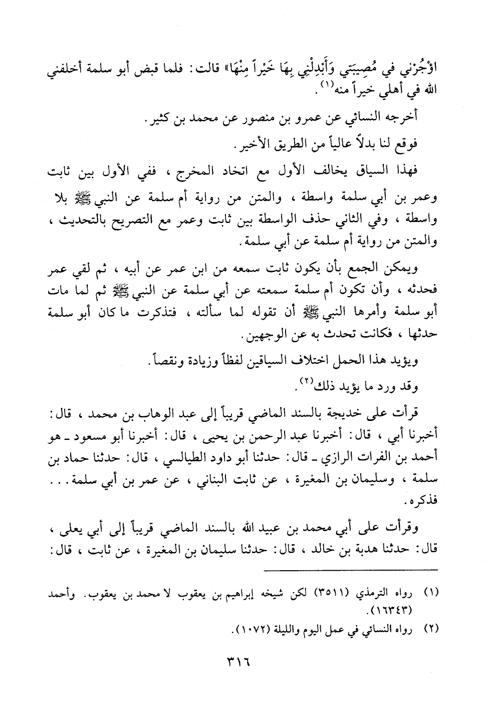 فهذا السياق يخالف الأول مع اتحاد المخرج، ففي الأول بين ثابت وعمر بن أبي سلمة واسطة، والمتن من رواية أم سلمة عن النبي صلى الله عليه وسلم بلا واسطة، وفي الثاني حذف الواسطة بين ثابت وعمر مع التصريح بالتحديث، والمتن من رواية أم سلمة عن أبي سلمة.