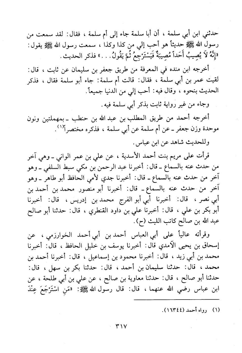 وقرأته عالياً على أبي العباس أحمد بن أبي أحمد الخوارزمي، عن إسحاق بن يحيى الآمدي قال: أخبرنا يوسف بن خليل الحافظ، قال: أخبرنا محمد بن أبي زيد، قال: أخبرنا محمود بن إسماعيل، قال: أخبرنا أحمد بن محمد، قال: حدثنا سليمان بن أحمد، قال: حدثنا بكر بن سهل، قال: حدثنا أبو صالح، قال: حدثنا معاوية بن صالح، عن علي بن أبي طلحة، عن ابن عباس رضي الله عنهما، قال: قال رسول الله صلى الله عليه وسلم: ((من استرجع عند