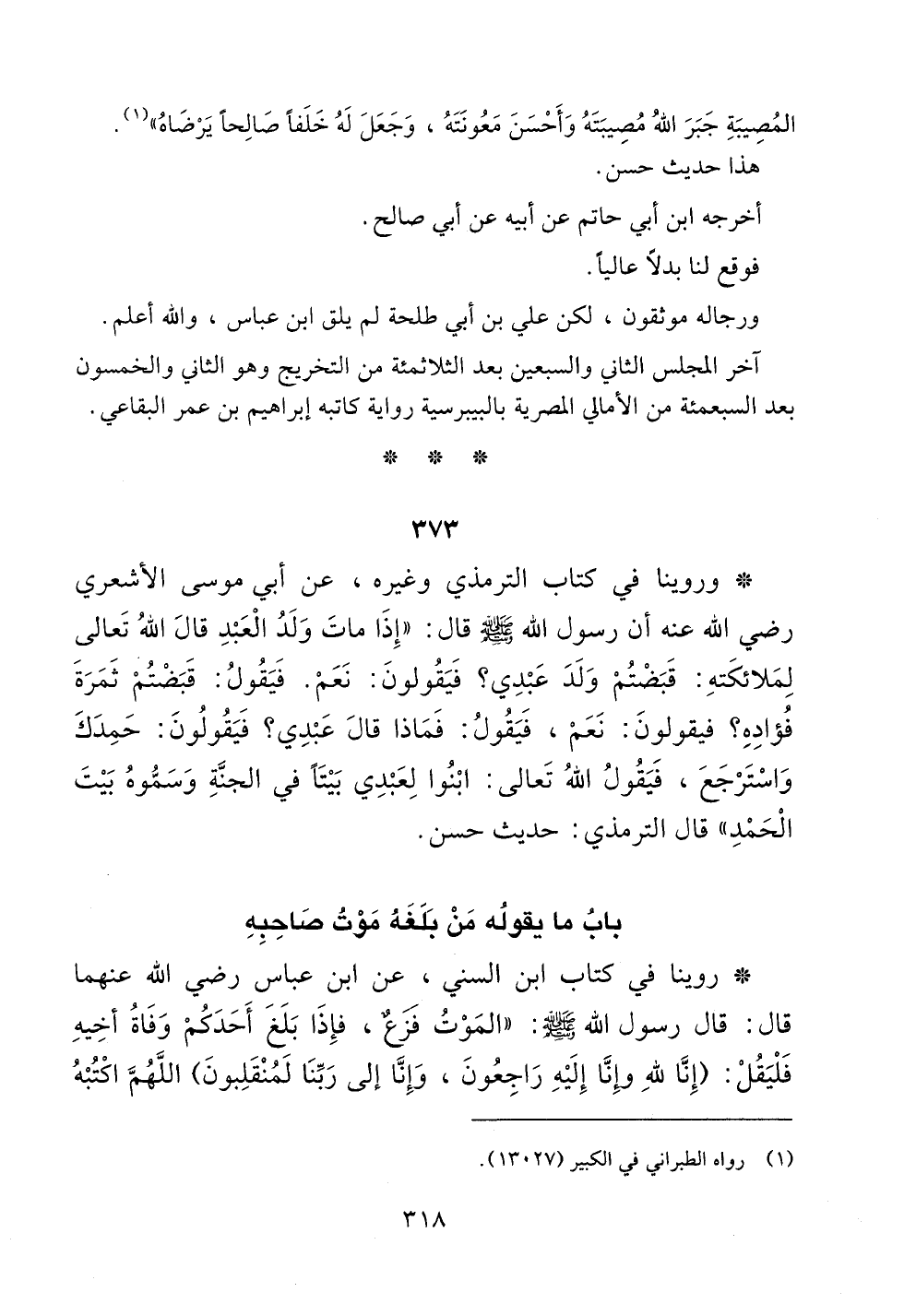 [[وروينا في كتاب الترمذي وغيره، عن أبي موسى الأشعري رضي الله عنه أن رسول الله صلى الله عليه وسلم قال: ((إذا مات ولد العبد قال الله تعالى لملائكته: قبضتم ولد عبدي؟ فيقولون: نعم، فيقول: قبضتم ثمرة فؤاده؟ فيقولون: نعم، فيقول: فماذا قال عبدي؟ فيقولون: حمدك واسترجع، فيقول الله تعالى: ابنوا لعبدي بيتاً في الجنة وسموه بيت الحمد)) قال الترمذي: حديث حسن.