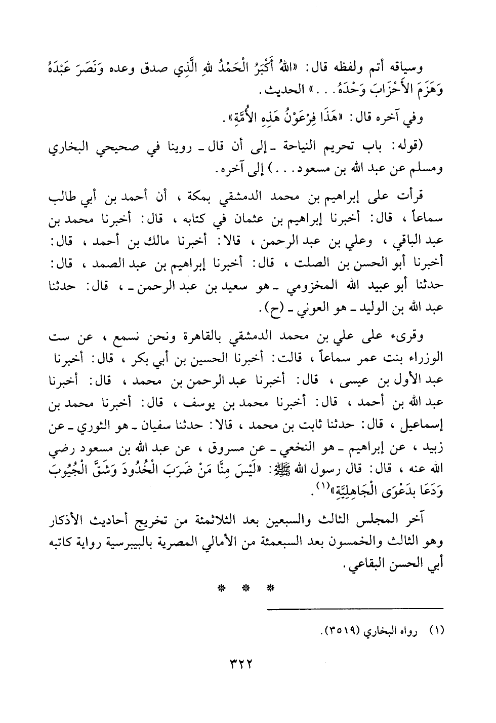 آخر المجلس الثالث والسبعين بعد الثلاثمئة من تخريج أحاديث الأذكار وهو الثالث والخمسون بعد السبعمئة من الأمالي المصرية بالبيبرسية رواية كاتبه أبي الحسن البقاعي.