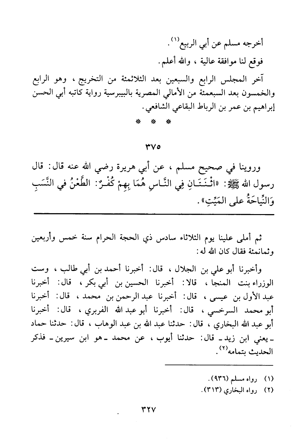 آخر المجلس الرابع والسبعين بعد الثلاثمئة من التخريج، وهو الرابع والخمسون بعد السبعمئة من الأمالي المصرية بالبيبرسية رواية كاتبه أبي الحسن إبراهيم بن عمر بن الرباط البقاعي الشافعي.