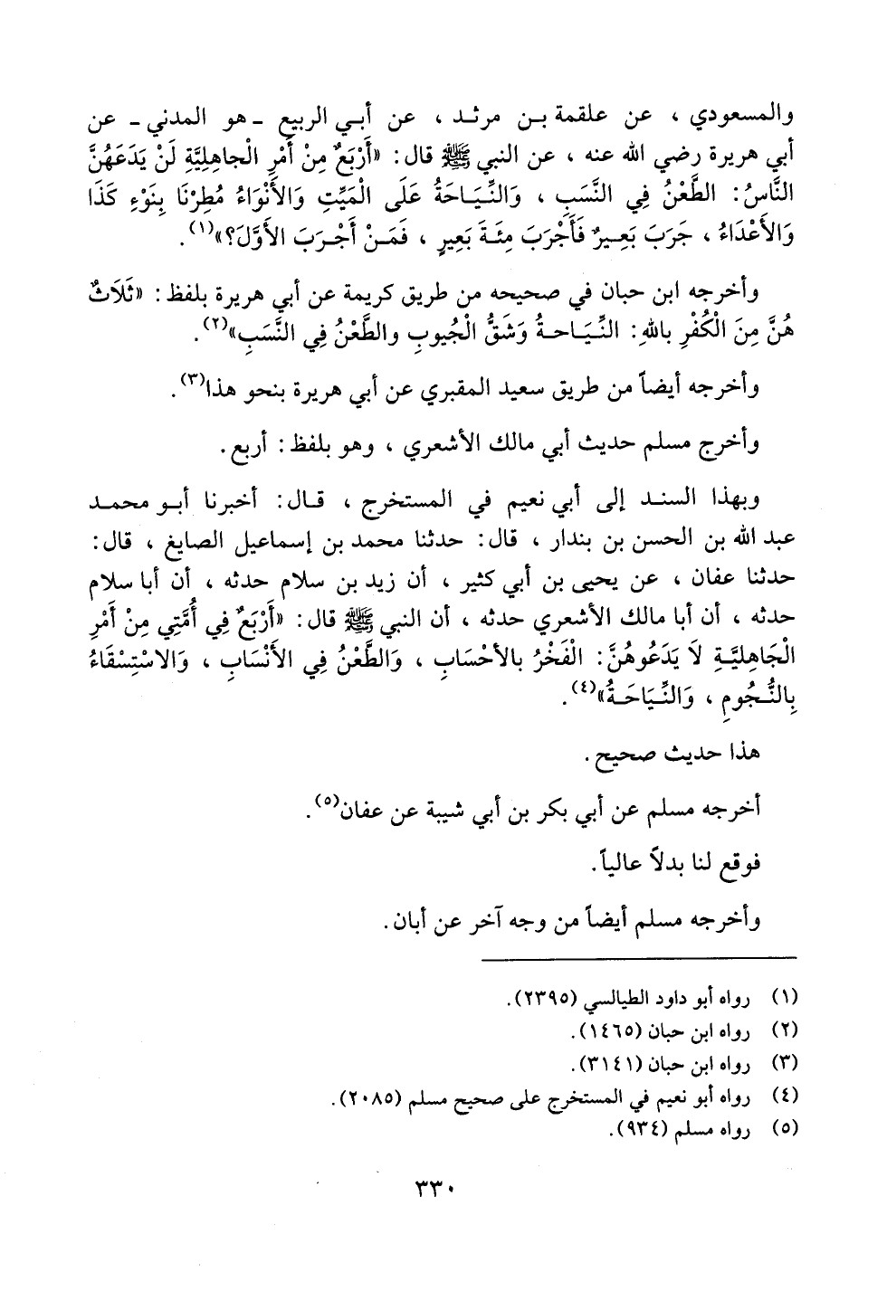 والمسعودي، عن علقمة بن مرشد، عن أبي الربيع -هو المدني- عن أبي هريرة رضي الله عنه، عن النبي صلى الله عليه وسلم قال: ((أربعٌ من أمر الجاهلية لن يدعهن الناس: الطعن في النسب، والنياحة على الميت والأنواء مطرنا بنوء كذا والأعداء، جرب بعيرٌ فأجرب مئة بعيرٍ، فمن أجرب الأول؟)).
