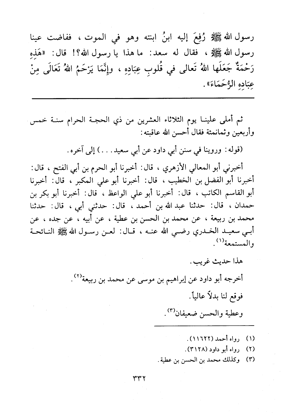 أخبرني أبو المعالي الأزهري، قال: أخبرنا أبو الحرم بن أبي الفتح، قال: أخبرنا أبو الفضل بن الخطيب، قال: أخبرنا أبو علي المكبر، قال: أخبرنا أبو القاسم الكاتب، قال: أخبرنا أبو علي الواعظ، قال: أخبرنا أبو بكر بن حمدان، قال: حدثنا عبد الله بن أحمد، قال: حدثني أبي، قال: حدثنا محمد بن ربيعة، عن محمد بن الحسن بن عطية، عن أبيه، عن جده، عن أبي سعيد الخدري رضي الله عنه، قال: لعن رسول الله صلى الله عليه وسلم النائحة والمستمعة.