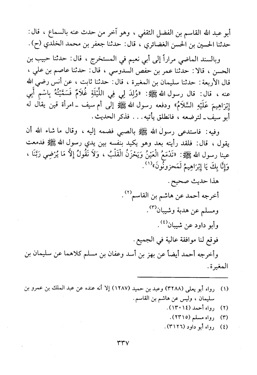 وبالسند الماضي مراراً إلى أبي نعيم في المستخرج، قال: حدثنا حبيب بن الحسن، قالا: حدثنا عمر بن حفص السدوسي، قال: حدثنا عاصم بن علي، قال الأربعة: حدثنا سليمان بن المغيرة، قال: حدثنا ثابت، عن أنس رضي الله عنه، قال: قال رسول الله صلى الله عليه وسلم: ((ولد لي في الليلة غلامٌ فسميته باسم أبي إبراهيم عليه السلام)) ودفعه رسول الله صلى الله عليه وسلم إلى أم سيف -امرأة قين يقال له أبو سيف- لترضعه، فانطلق يأتيه .. فذكر الحديث.