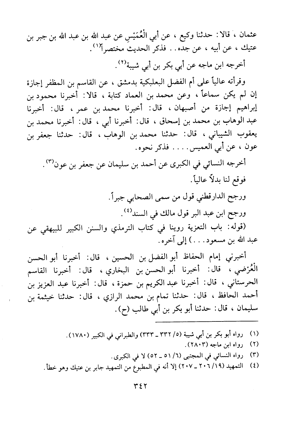 وقرأته عالياً على أم الفضل البعلبكية بدمشق، عن القاسم بن المظفر إجازة إن لم يكن سماعاً، وعن محمد بن العماد كتابة، قالا: أخبرنا محمود بن إبراهيم إجازة من أصبهان، قال: أخبرنا محمد بن عمر، قال: أخبرنا عبد الوهاب بن محمد بن إسحاق، قال: أخبرنا أبي، قال: أخبرنا محمد بن يعقوب الشيباني، قال: حدثنا محمد بن الوهاب، قال: حدثنا جعفر بن عون، عن أبي العميس .. .. فذكر نحوه.
