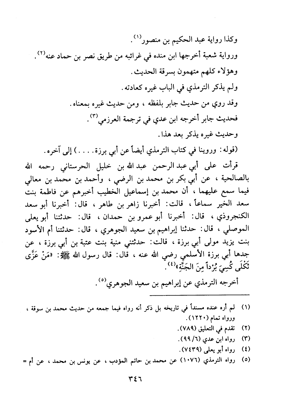 قرأت على أبي عبد الرحمن عبد الله بن خليل الحرستاني رحمه الله بالصالحية، عن أبي بكر بن محمد بن الرضي، وأحمد بن محمد بن معالي فيما سمع عليهما، أن محمد بن إسماعيل الخطيب أخبرهم عن فاطمة بنت سعد الخير سماعاً، قالت: أخبرنا زاهر بن طاهر، قال: أخبرنا أبو سعد الكنجروذي، قال: أخبرنا أبو عمرو بن حمدان، قال: حدثنا أبو يعلى الموصلي، قال حدثنا إبراهيم بن سعيد الجوهري، قال: حدثتنا أم الأسود بنت يزيد مولى أبي برزة، قالت: حدثتني منية بنت عتبة بن أبي برزة، عن جدها أبي برزة الأسلمي رضي الله عنه، قال: قال رسول الله صلى الله عليه وسلم: ((من عزى ثكلى كسي برداً من الجنة)).